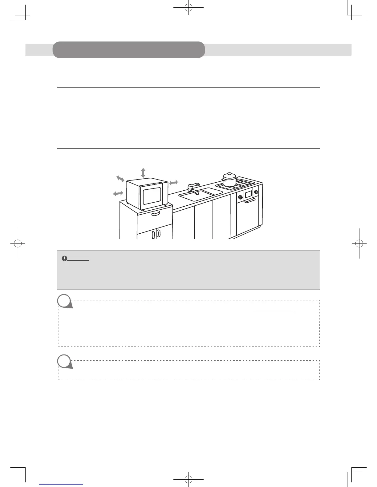 • Ensure that there is adequate ventilation around the microwave. Keep 30 cm of space free at the top. At the back and sides,