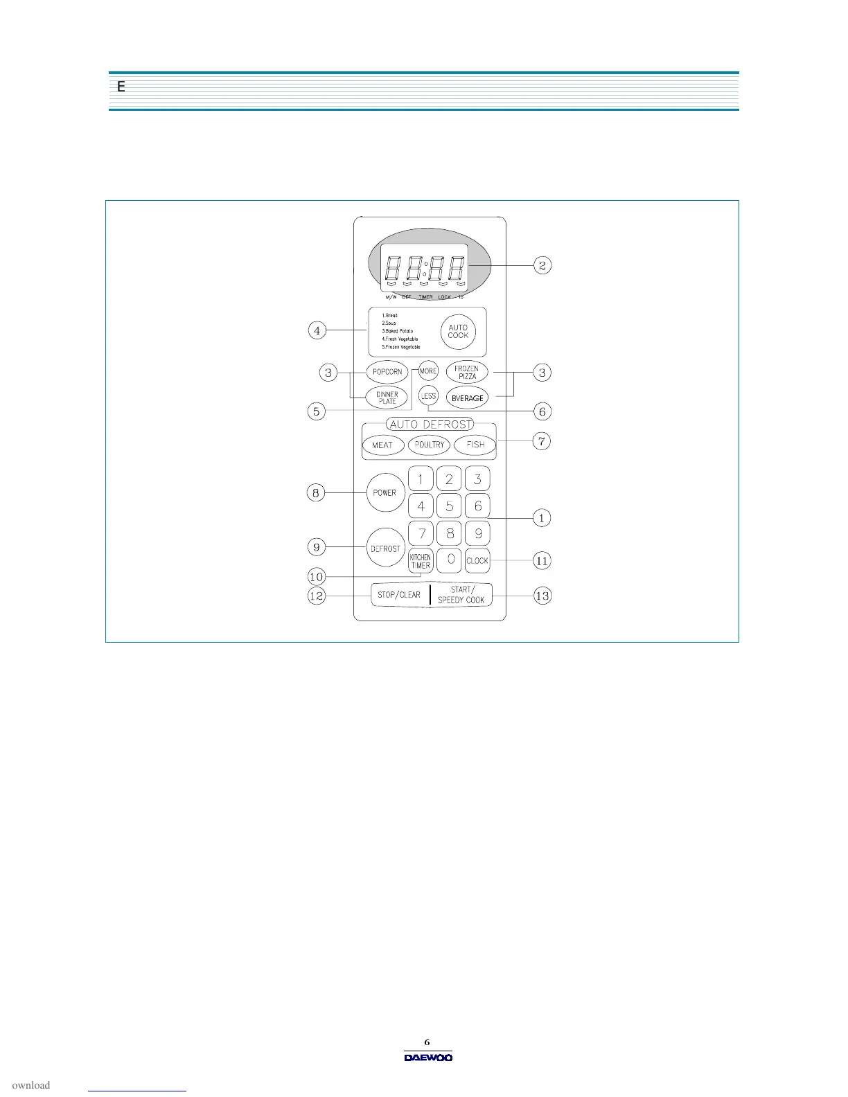 - Cooking time, power level, indicators and present time are displayed.