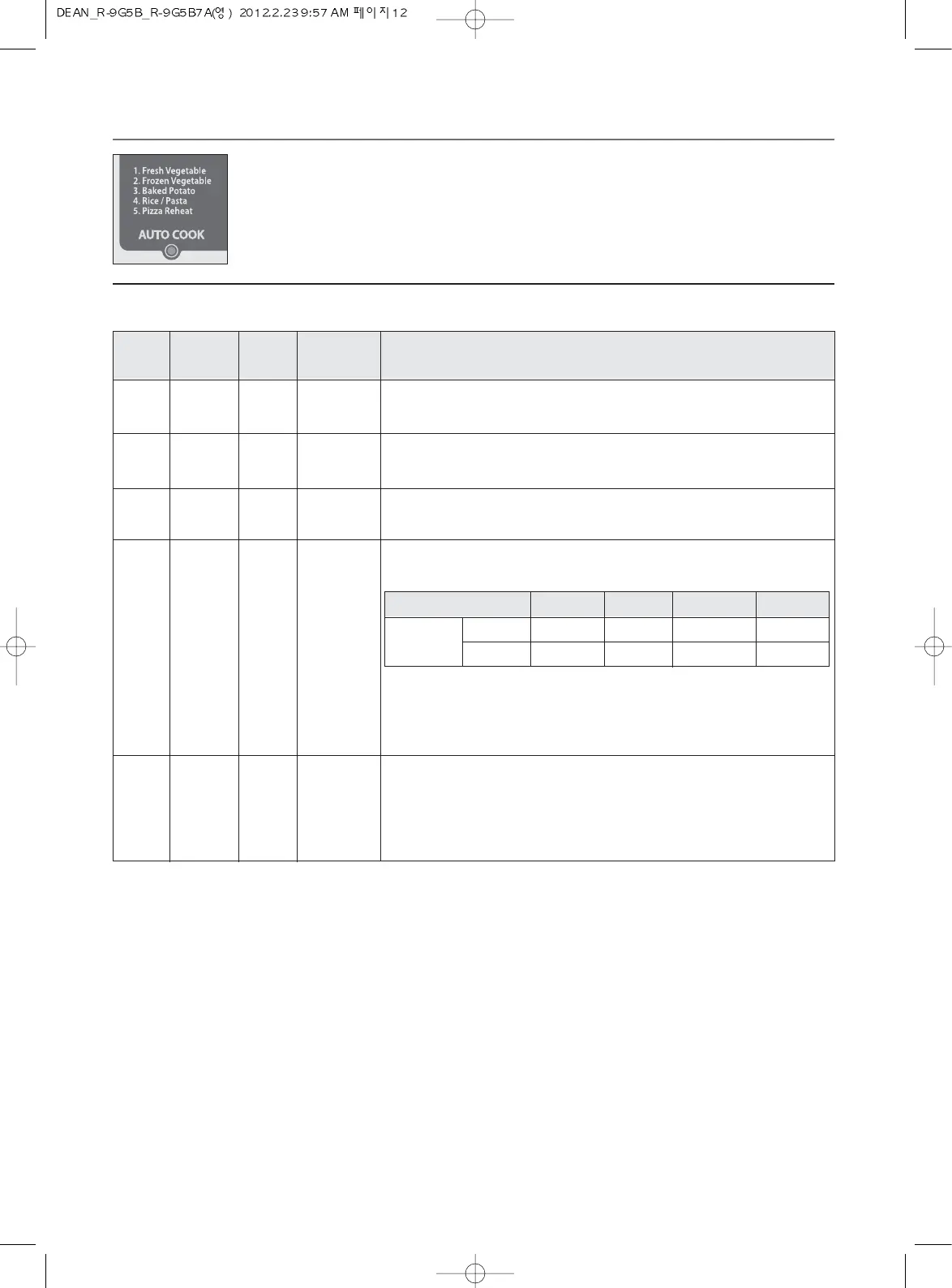 (Refer to the AUTO COOK chart below)
