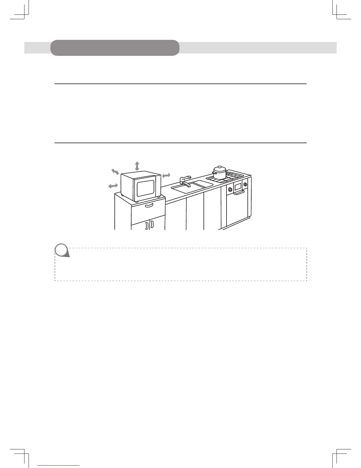 • Ensure that there is adequate ventilation around the microwave. Keep 30 cm of space free at the top. At the back and sides,