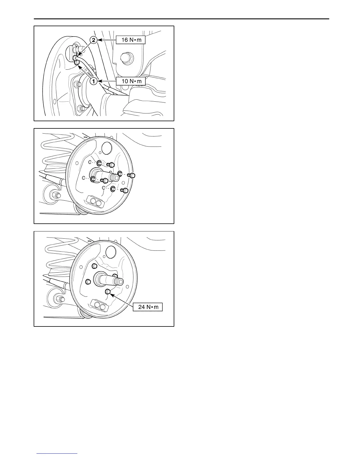 Tighten the backing plate–to–rear axle bolts to 24