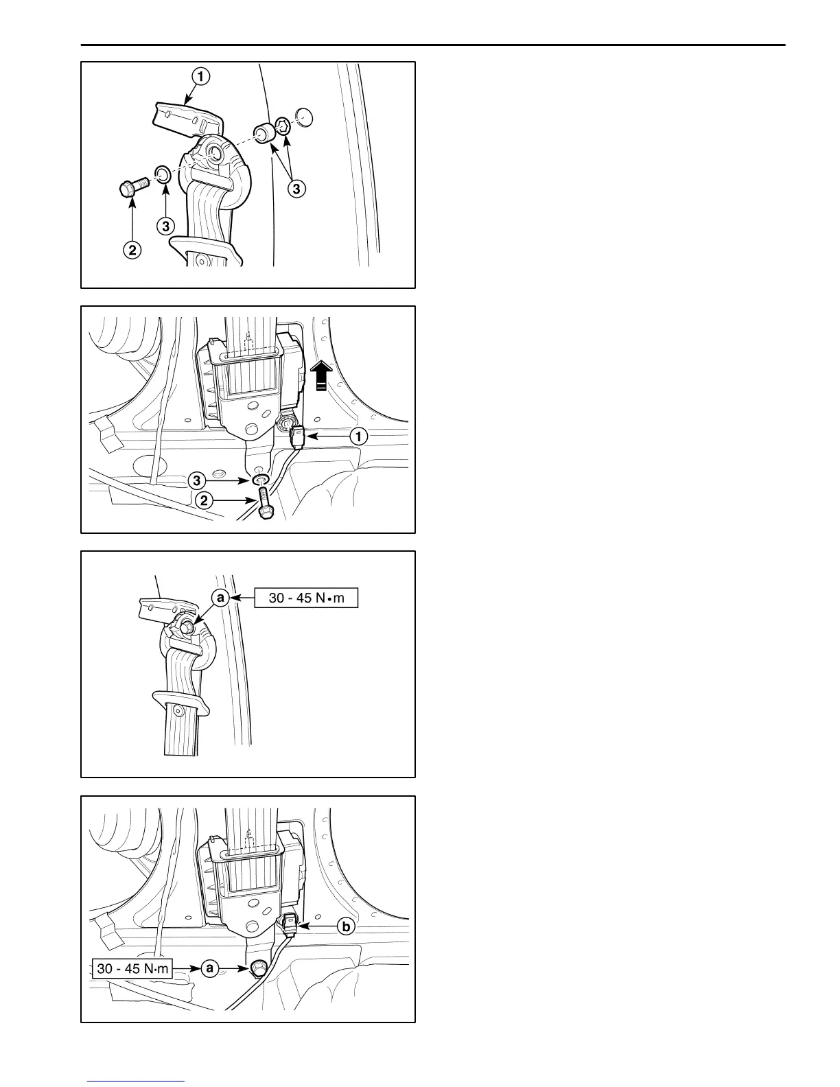 Tighten the seat belt upper bolt to 30–45 NSm (22–33