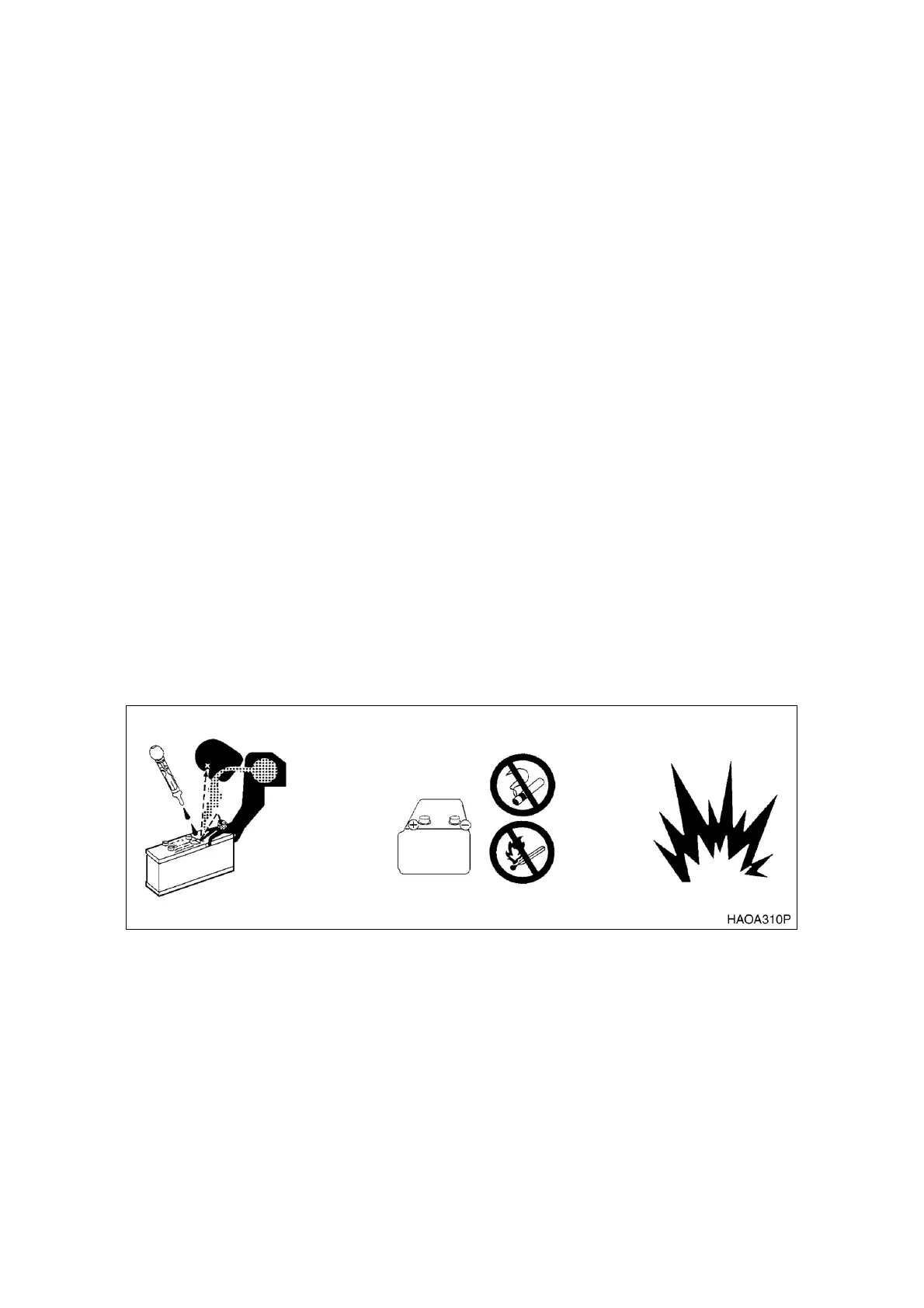 • Explosive battery gas can be set off by sparks from incidental contact or static discharge. Turn