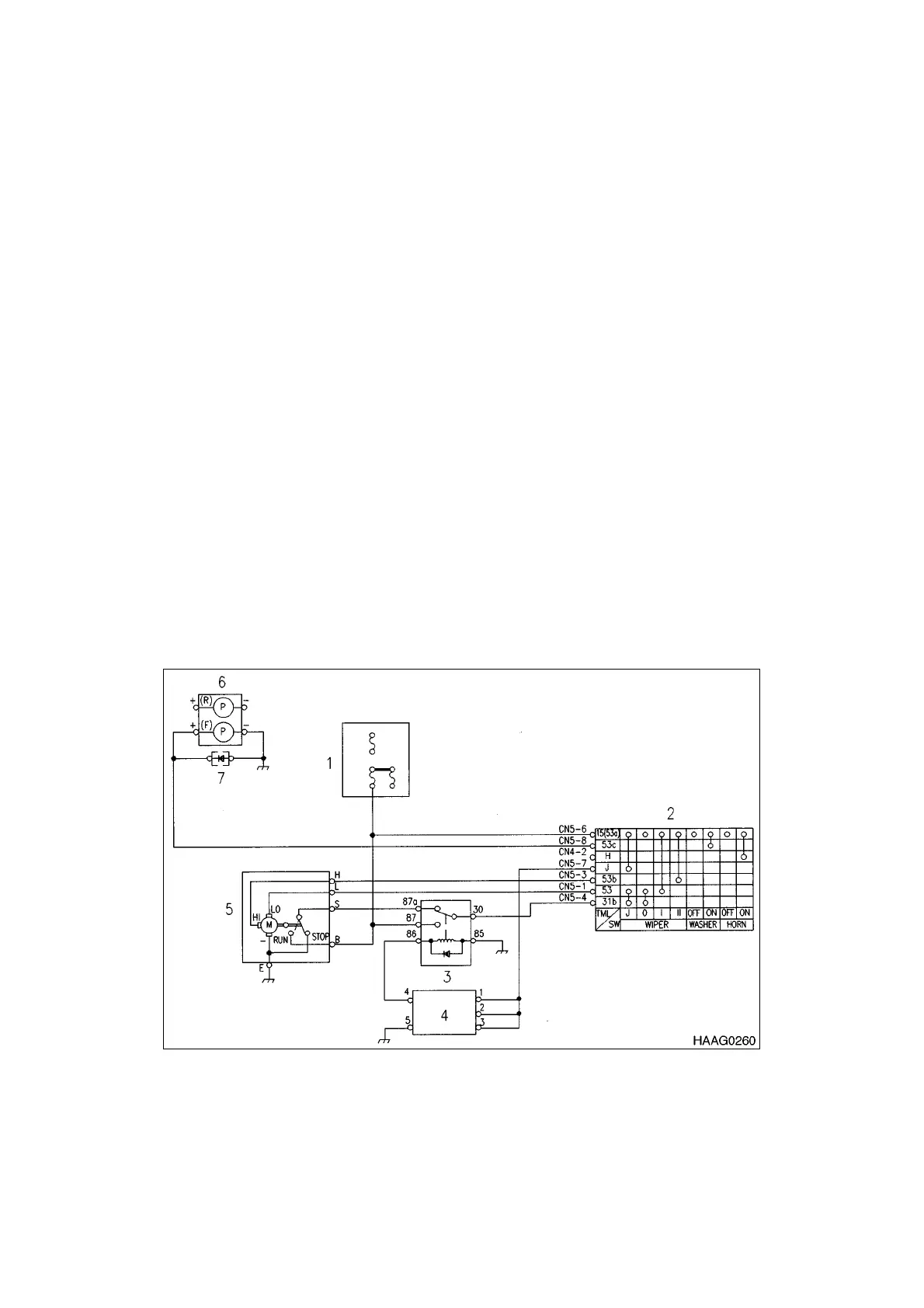 terminal of wiper relay (3) to the 31b,53 terminal of wiper switch (2) - L,E terminal of wiper motor (5).