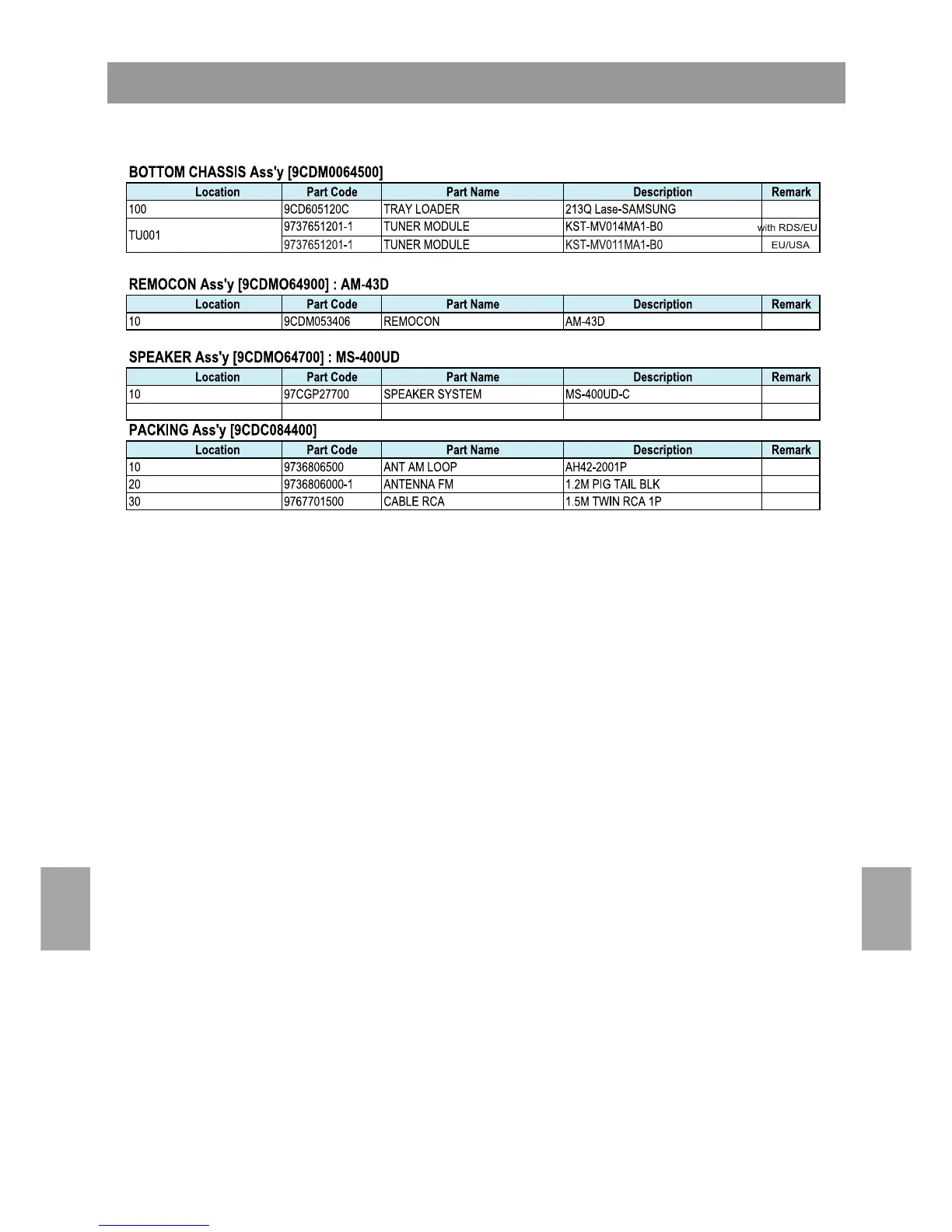 Daewoo RD-430 - Appendix: Electrical Part Lists (Part 3); BOTTOM CHASSIS Assy Parts List; REMOCON Assy Parts List; SPEAKER Assy Parts List