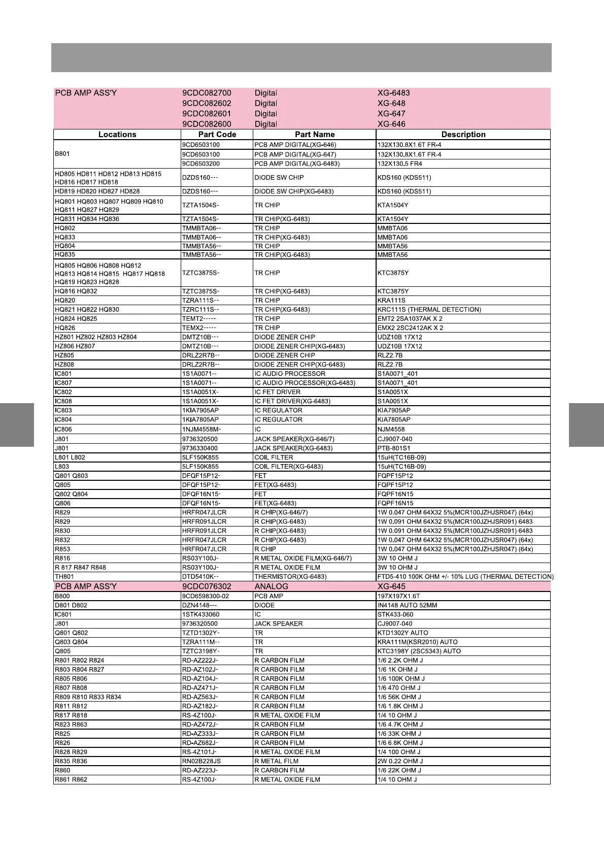 Daewoo XG-646 - Appendix - Electrical Part List (Continued); PCB AMP Assembly Parts