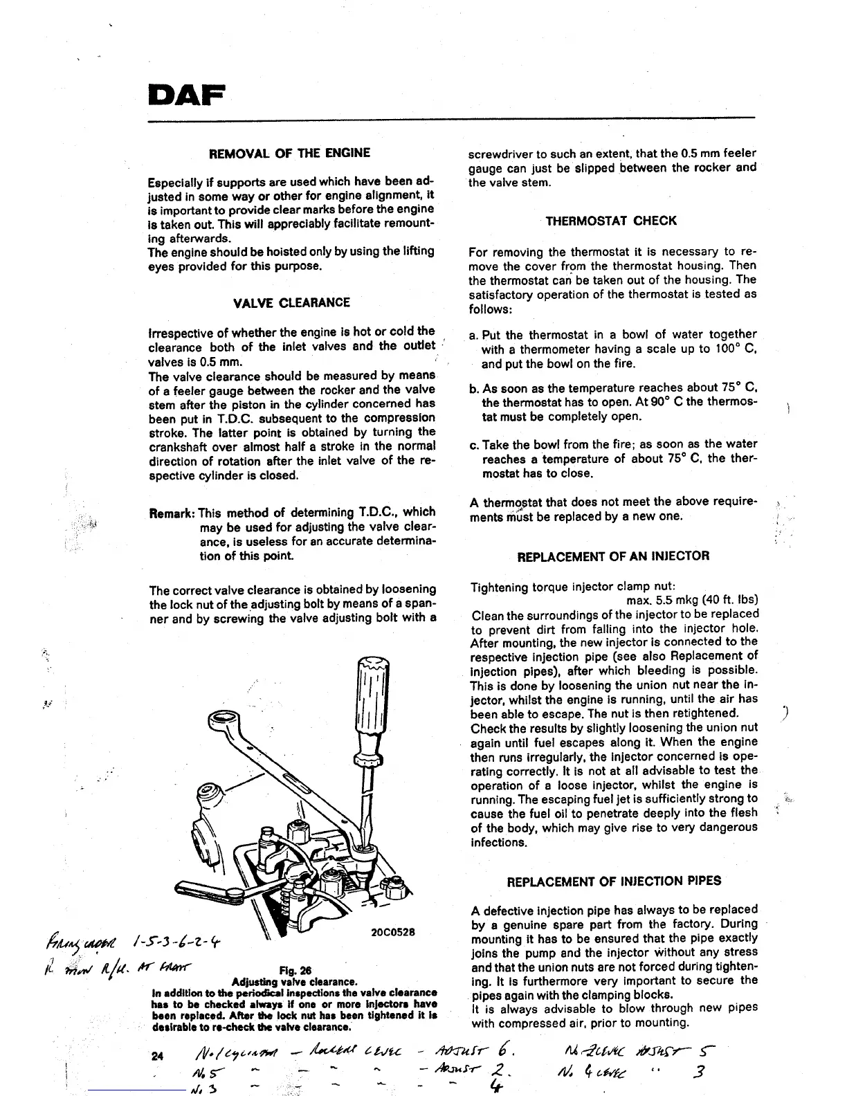DAF DA 475 - Engine Removal and Valve Clearance; Engine Removal Procedure; Valve Clearance Adjustment; Thermostat and Injector Replacement