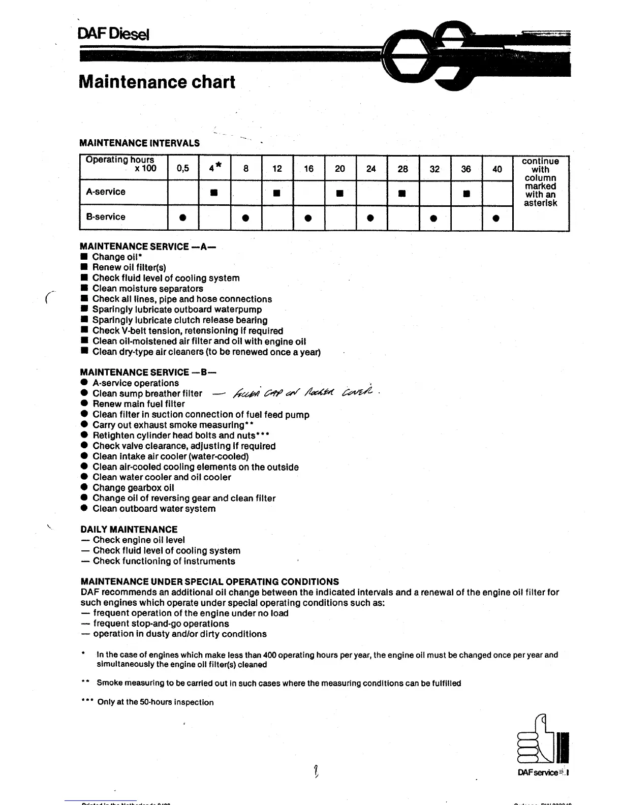 DAF DA 475 - Service Interval Schedules; Daily Maintenance Tasks; Special Operating Conditions