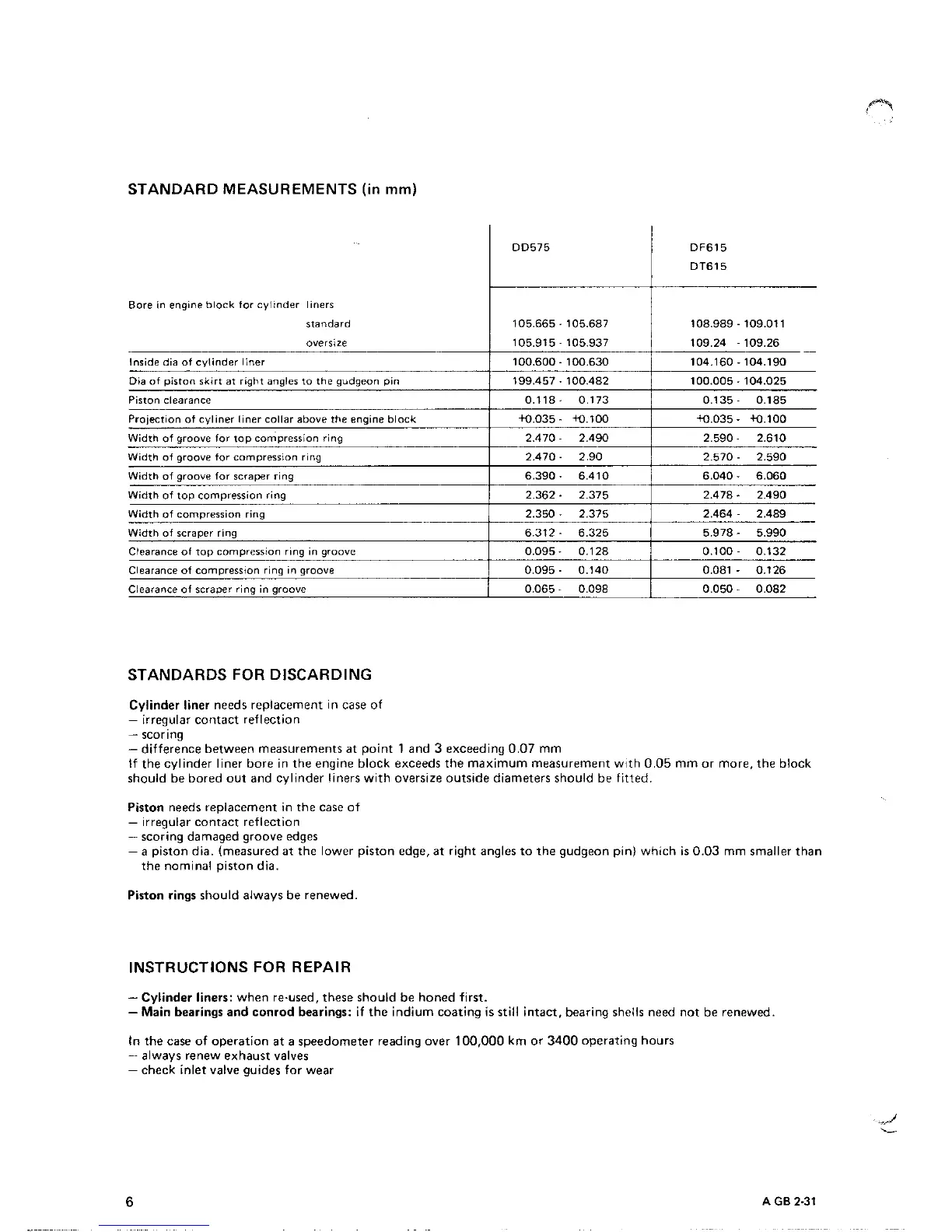 DAF DD 575 - Cylinder Liner Wear Measuring: Standard Measurements (in MM); Cylinder Liner Wear Measuring: Standards for Discarding; Cylinder Liner Wear Measuring: Instructions for Repair
