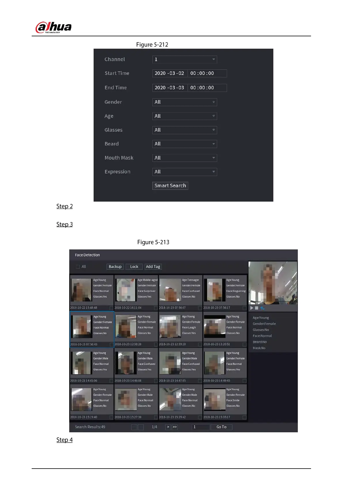Select the channel, enter the start time and end time, and set for the gender, age, glasses,