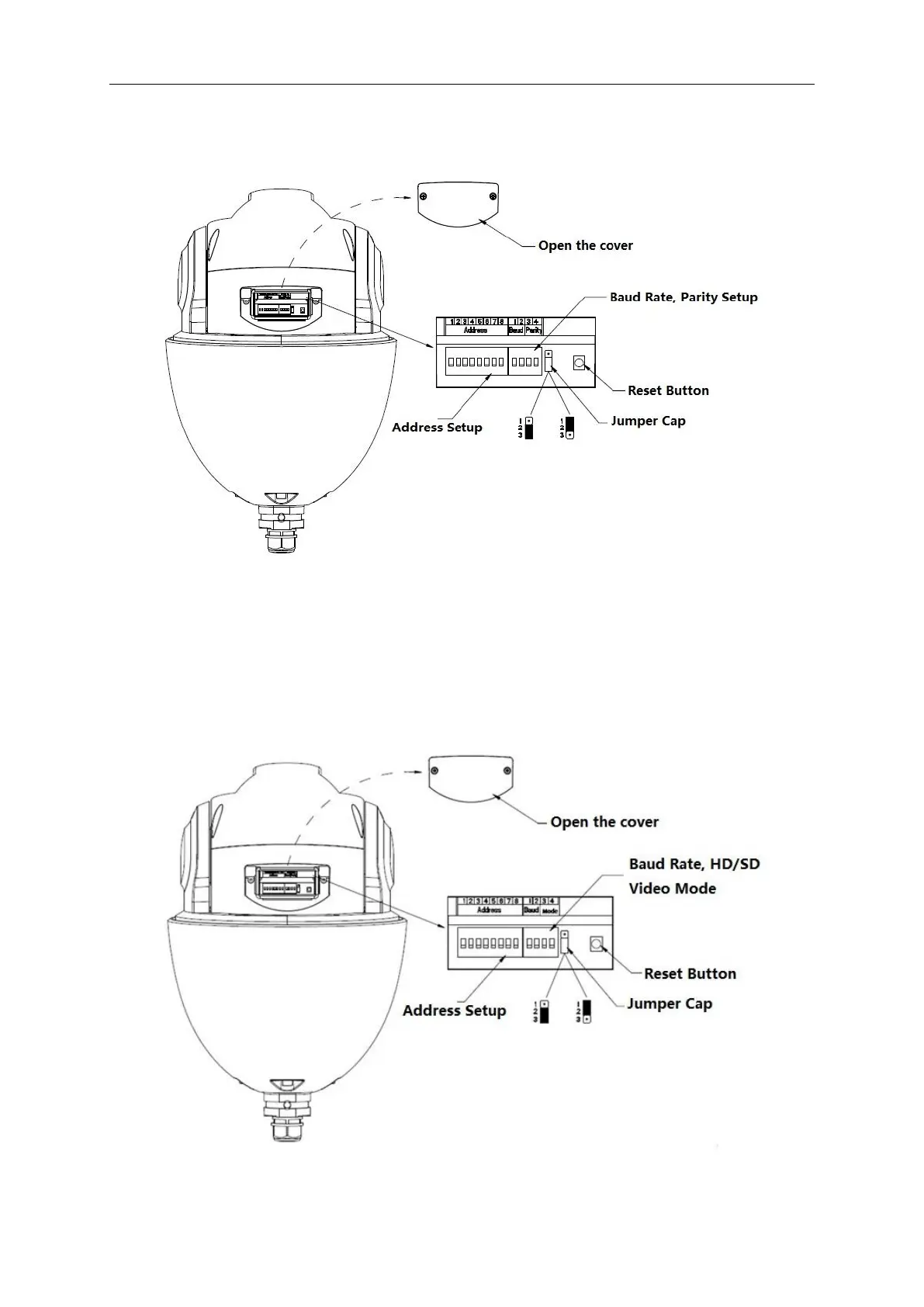 Open the cover of the speed dome; you can see there are two dial switch buttons on the PTZ