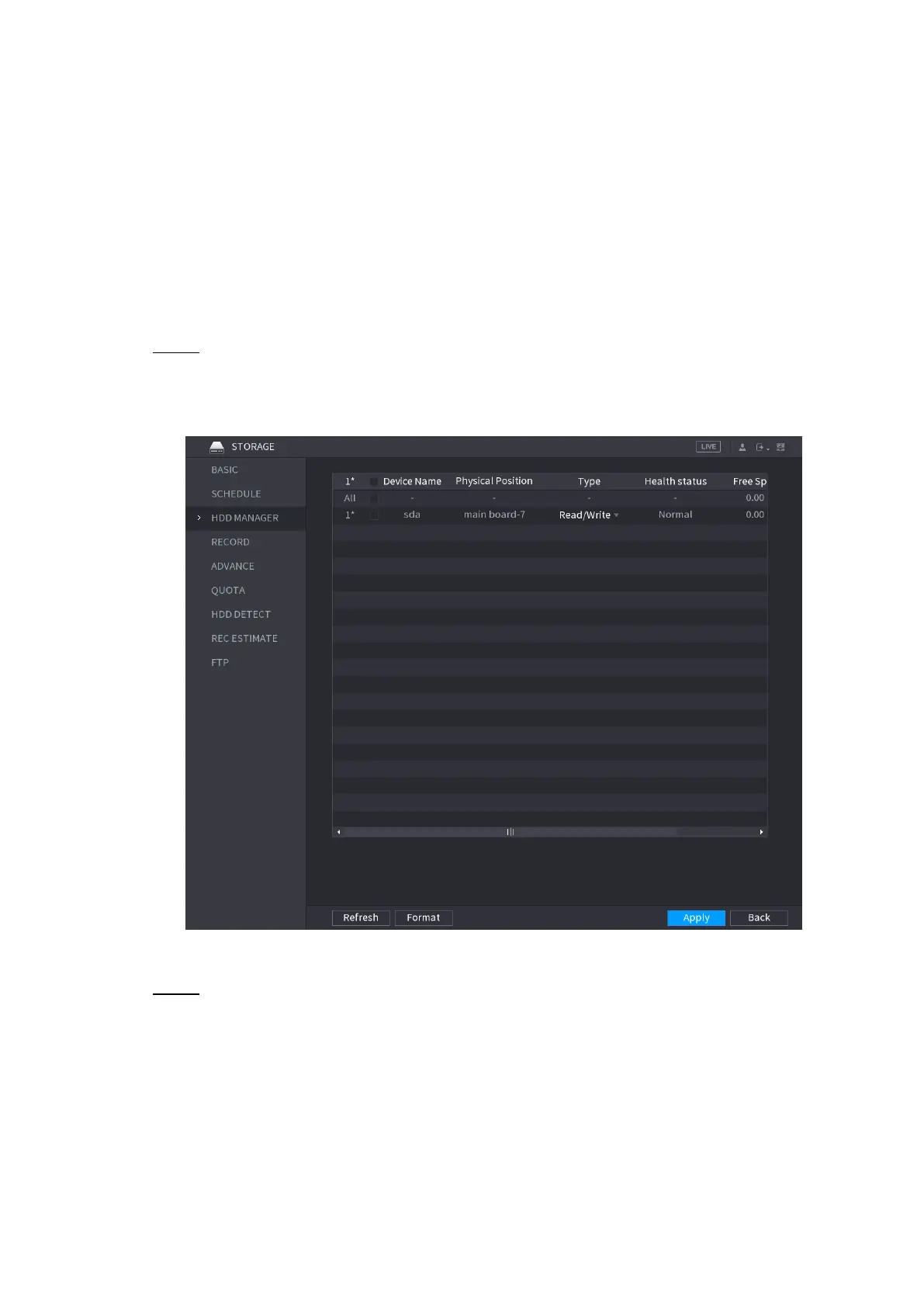 Select Main Menu > STORAGE > HDD MANAGER. Step 1
