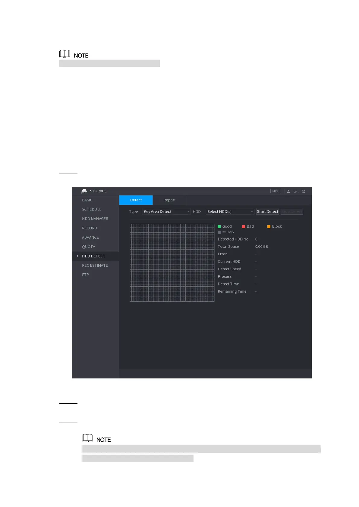 Select Main Menu > STORAGE > HDD DETECT > Detect. Step 1