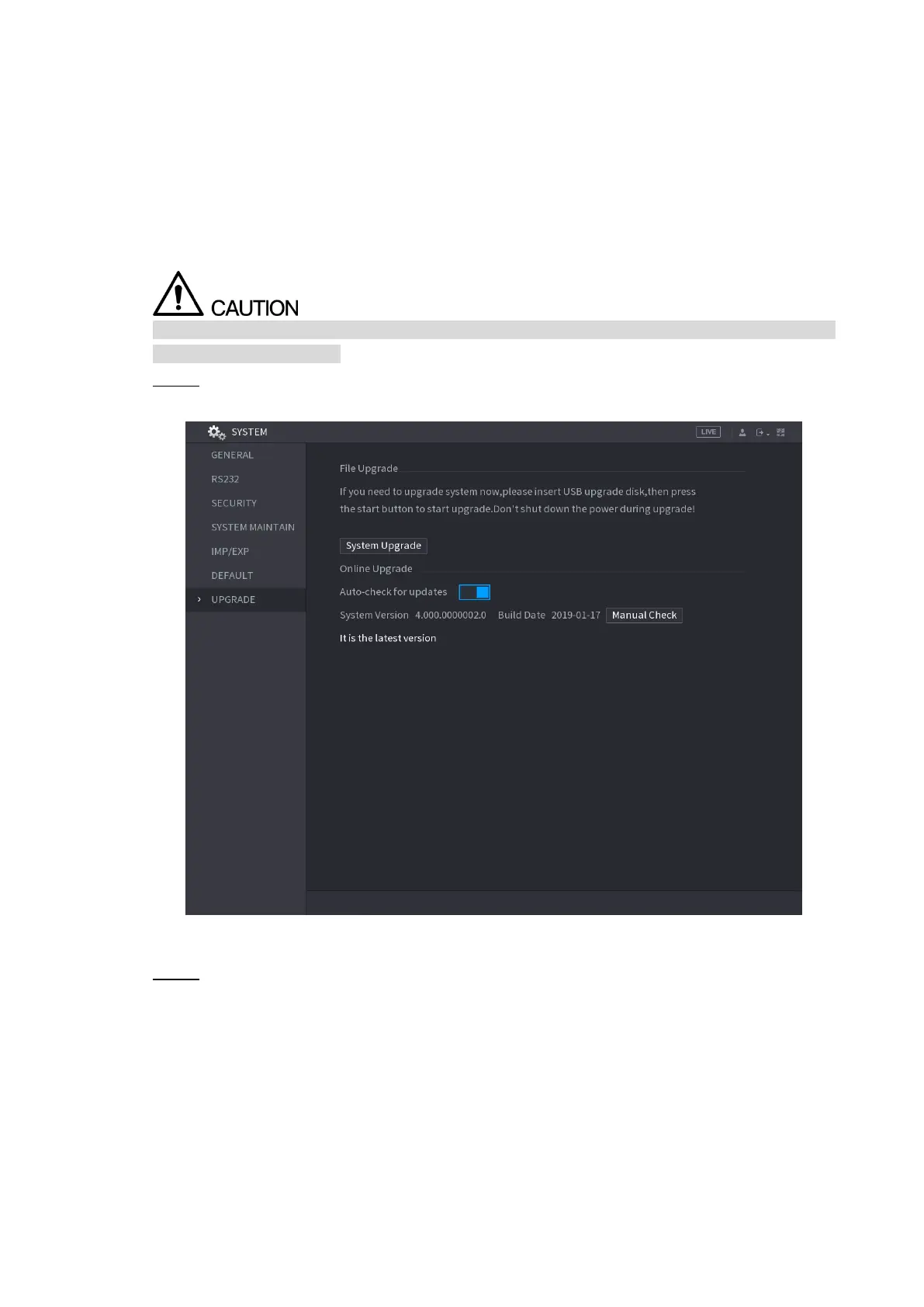 Select Main Menu > SYSTEM > UPGRADE. Step 1