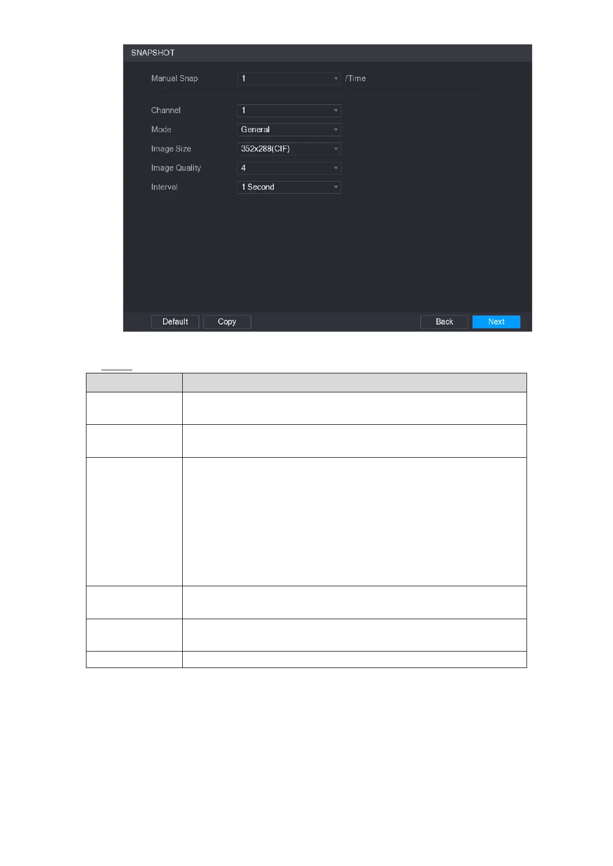 Configure the settings for the snapshot parameters. See Table 5-7. Step 2