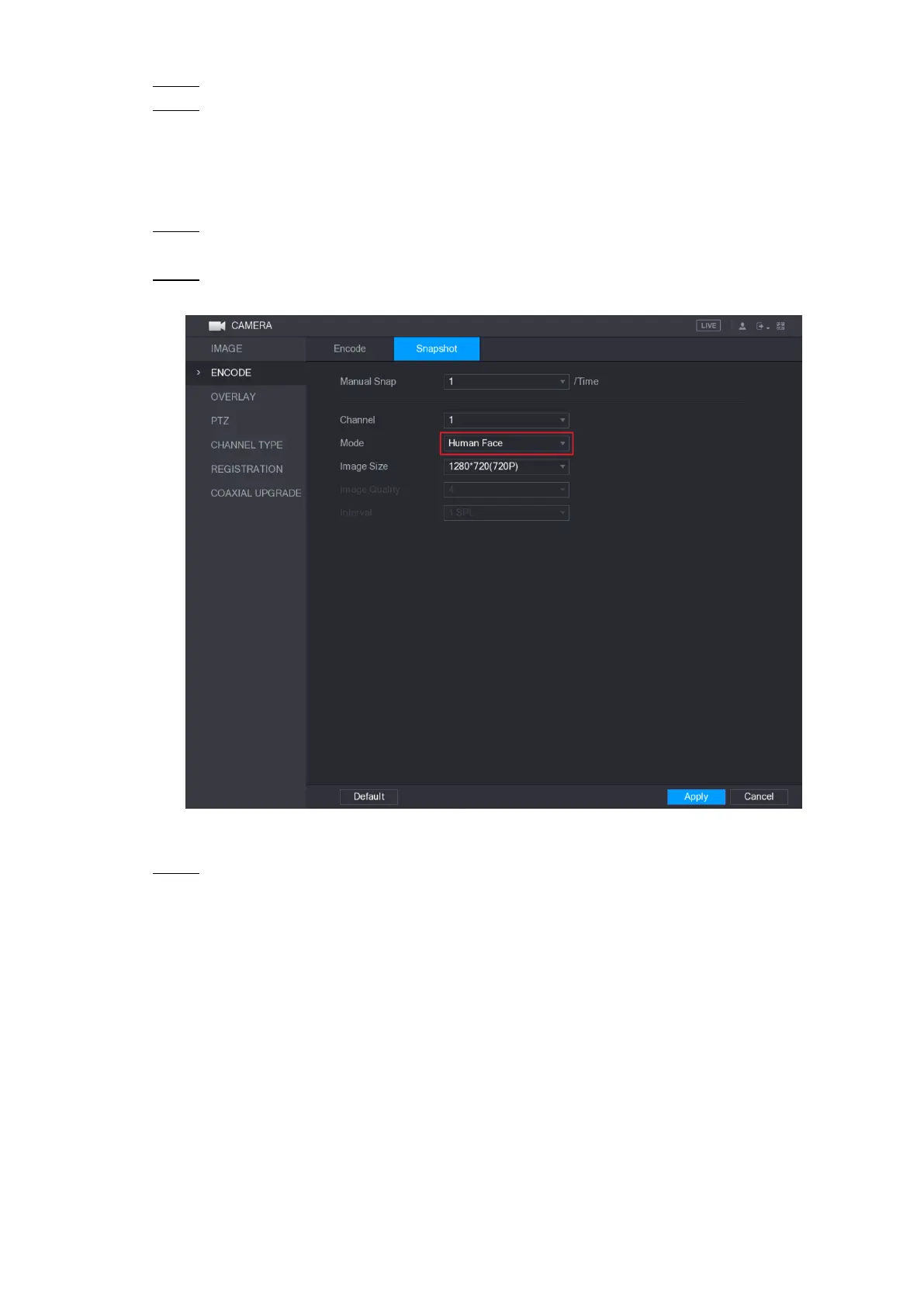 Select Main Menu > CAMERA > ENCODE > Snapshot. Step 1