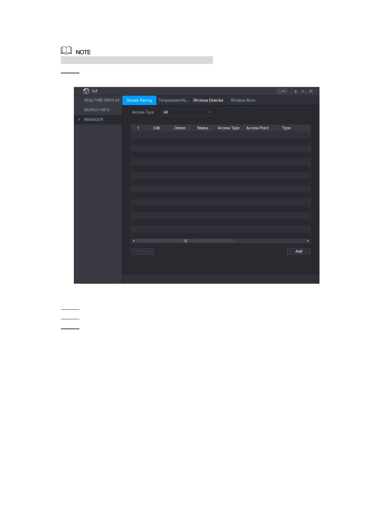 Select Main Menu > IoT > MANAGER > Sensor Pairing. Step 1