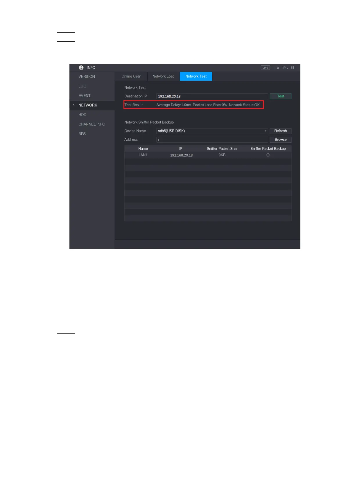Select Main Menu > INFO > NETWORK > Network Test. Step 1