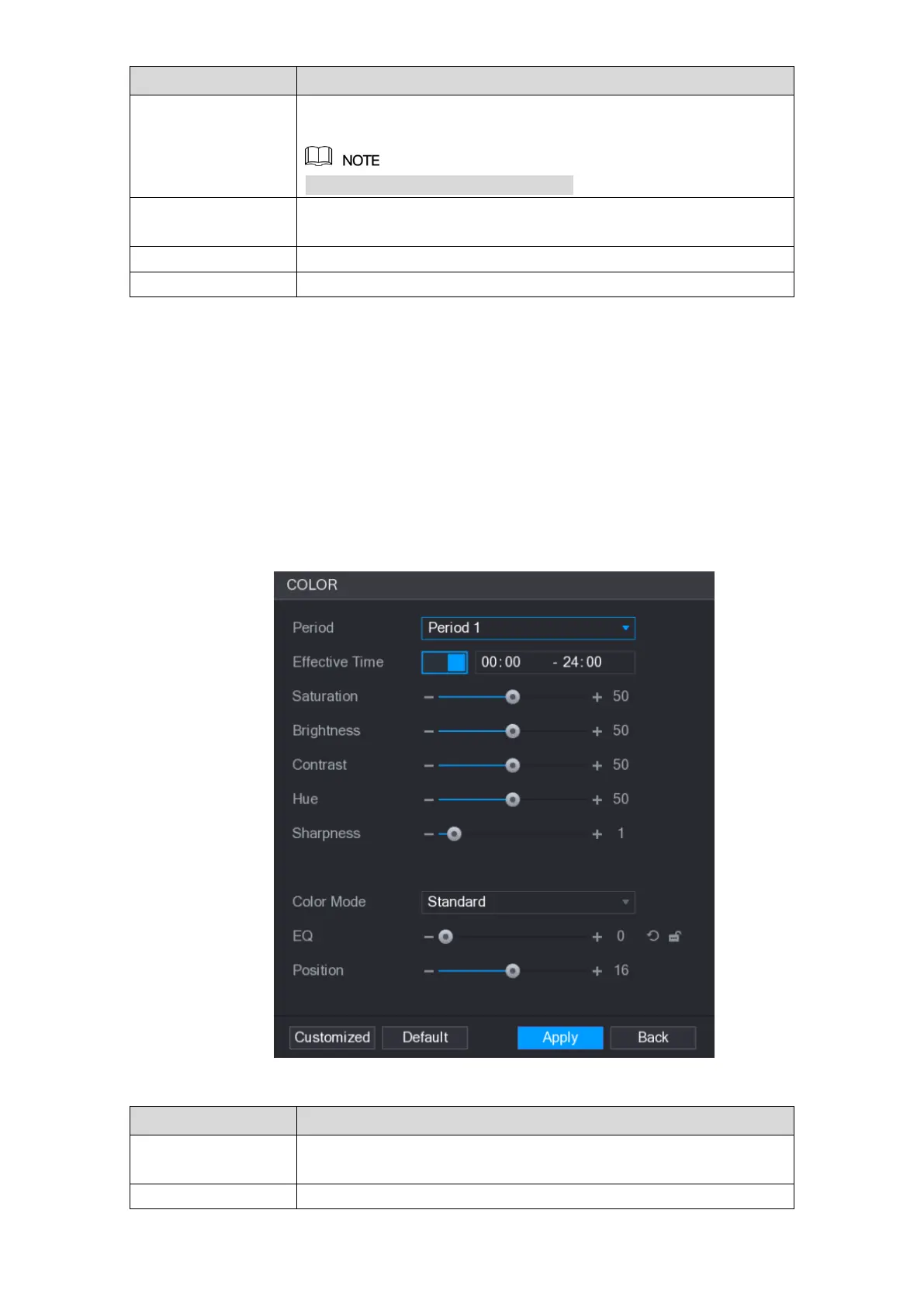 You can adjust the video image color effect such as sharpness, brightness, and contrast. The