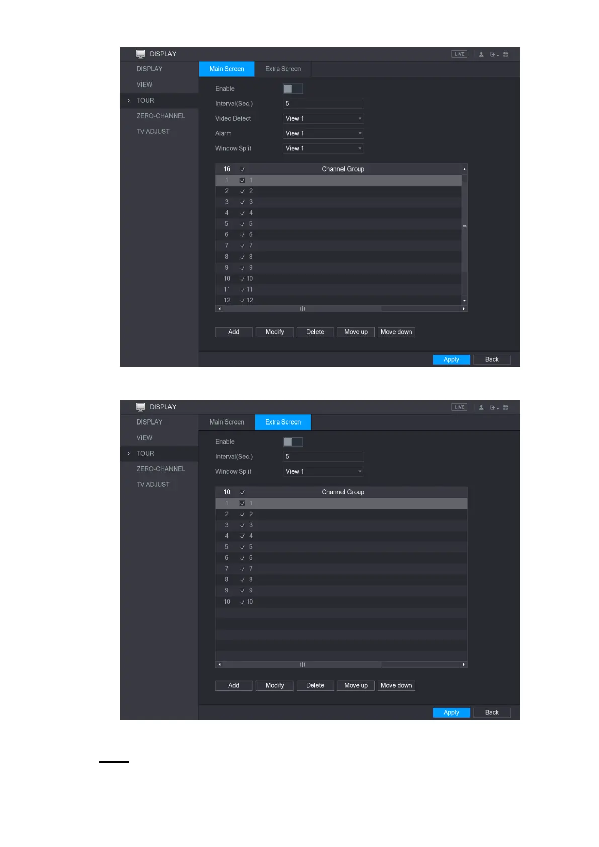 Configure the settings for the tour parameters for both Main Screen and Extra Screen. Step 2