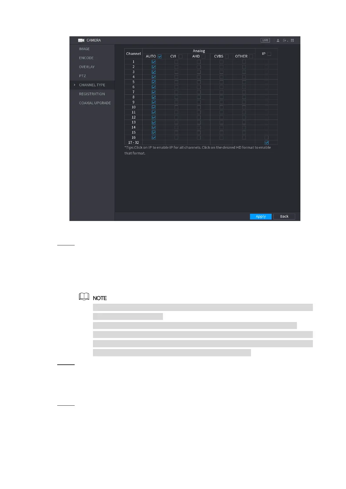 Analog Channel: Select the transmission medium such as CVI, CVBS, and then