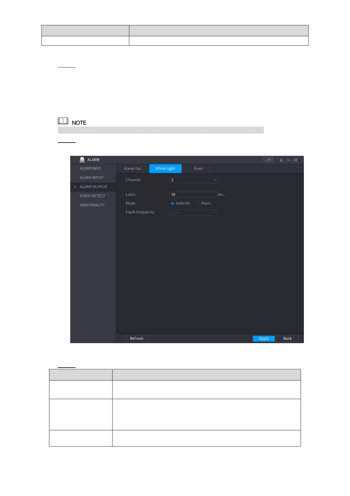 Select Main Menu > ALARM > ALARM OUTPUT > White Light. Step 1
