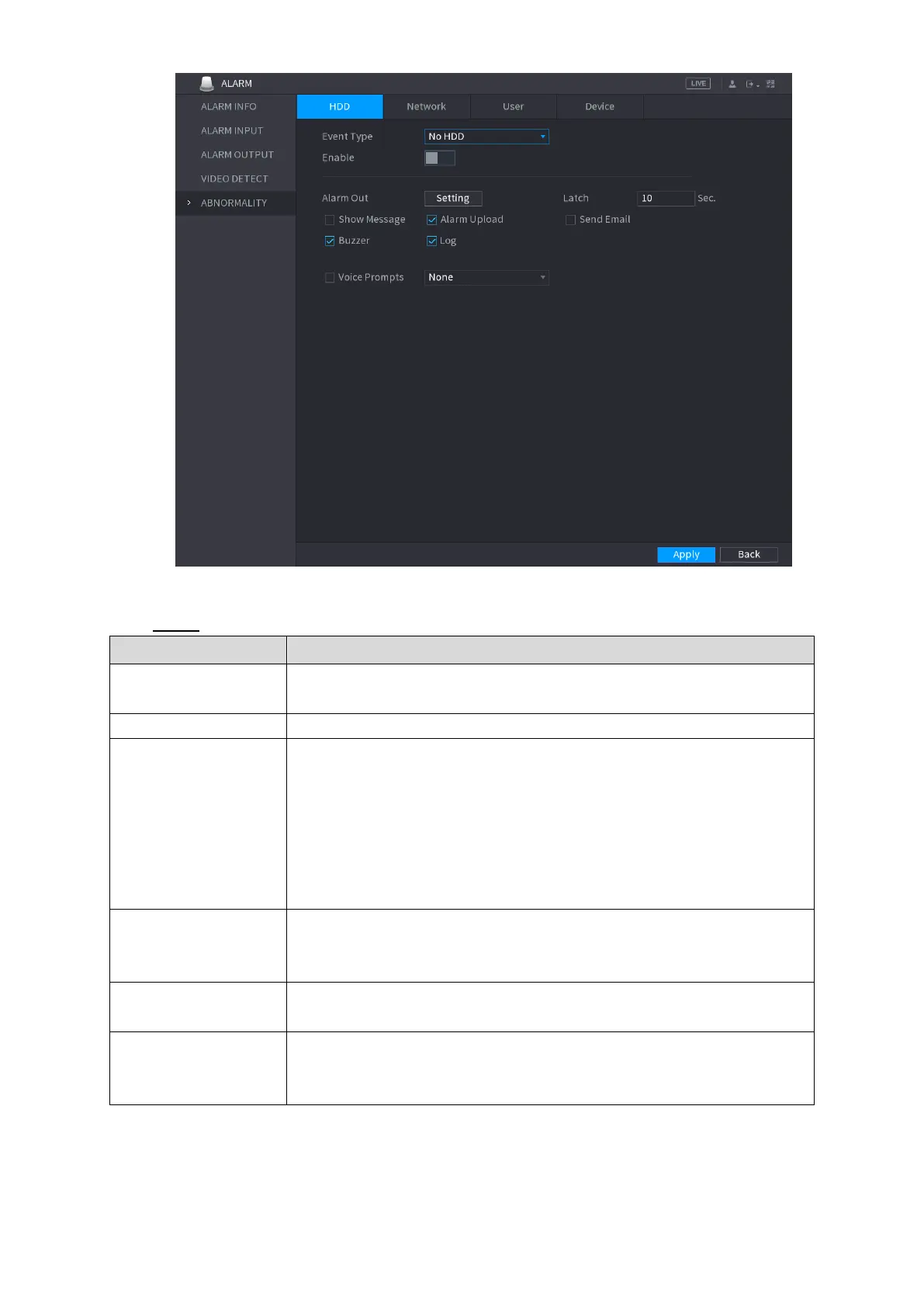 Configure the settings for the HDD event. See Table 5-41. Step 2