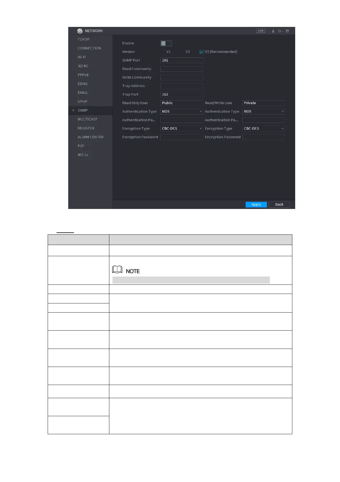 Configure the settings for the SNMP parameters. See Table 5-66. Step 2