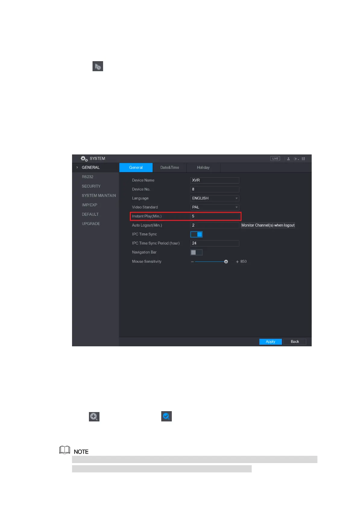 To change the playback time, select Main Menu > SYSTEM > GENERAL, in the Instant