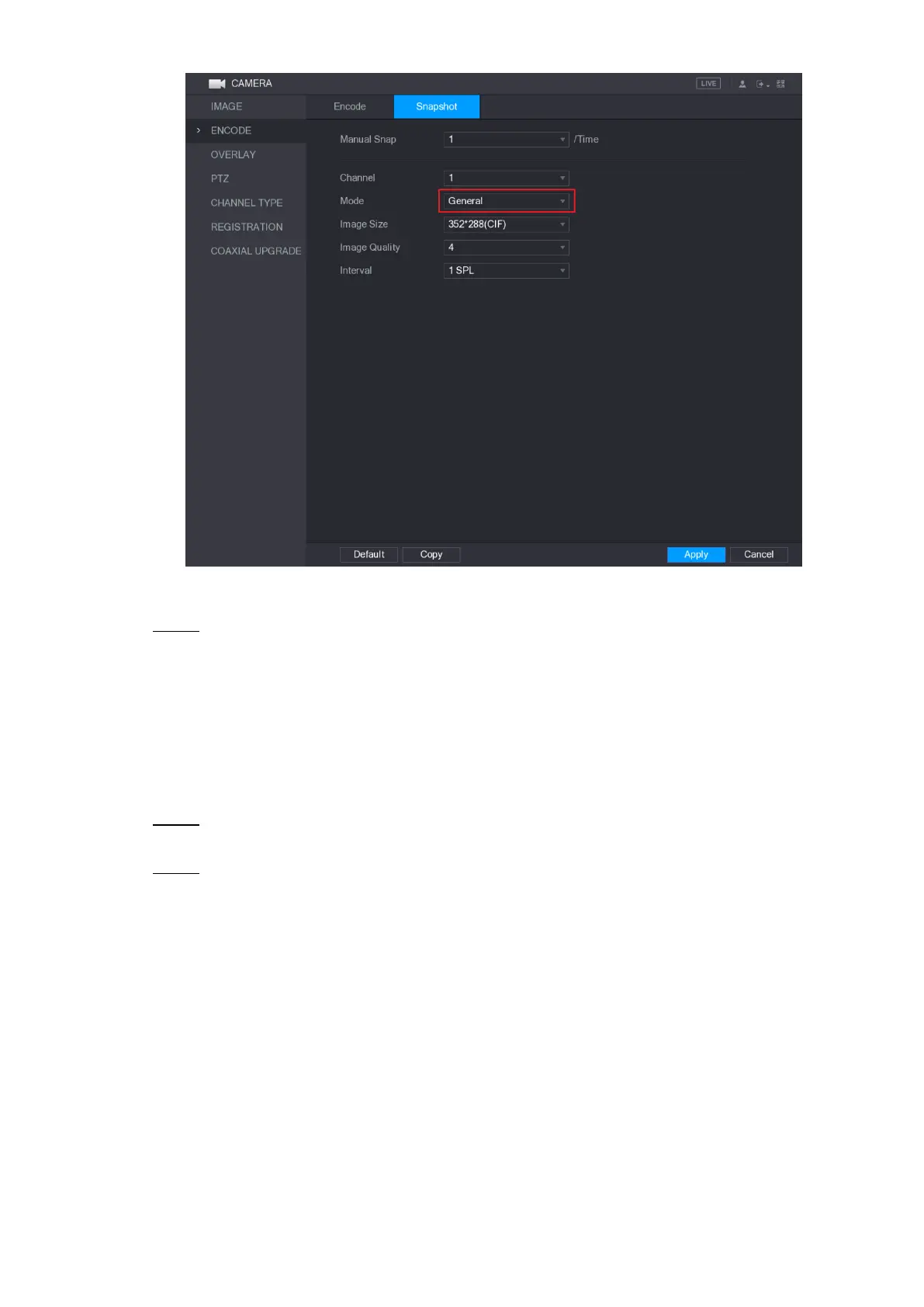 Select Main Menu > CAMERA > ENCODE > Snapshot. Step 1