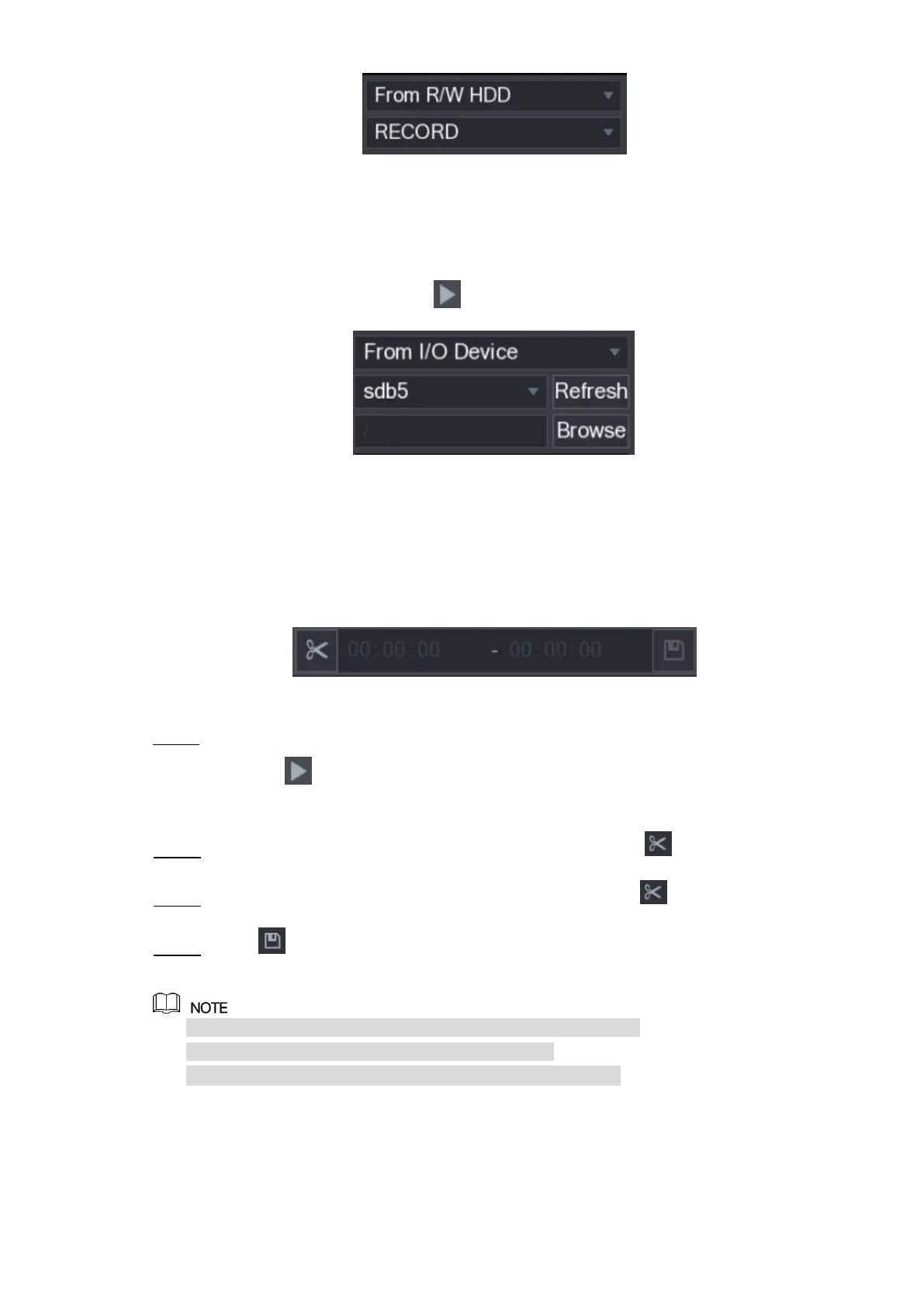 During playback, clip sections of recorded video and save to the USB storage device. For the
