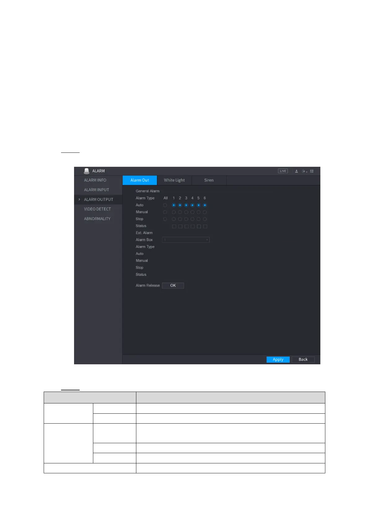 Select Main Menu > ALARM > ALARM OUTPUT > ALARM Out. Step 1
