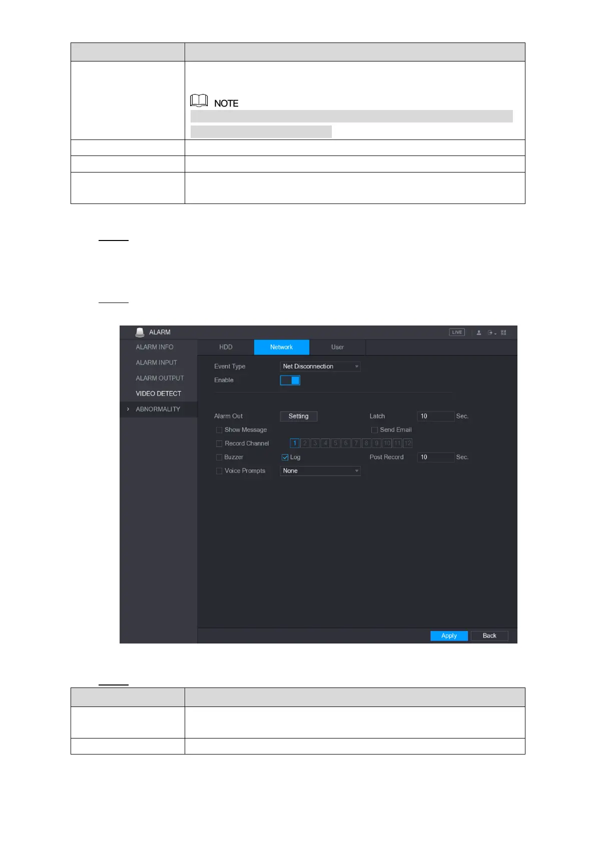 Select Main Menu > ALARM > ABNORMITY > Network. Step 1