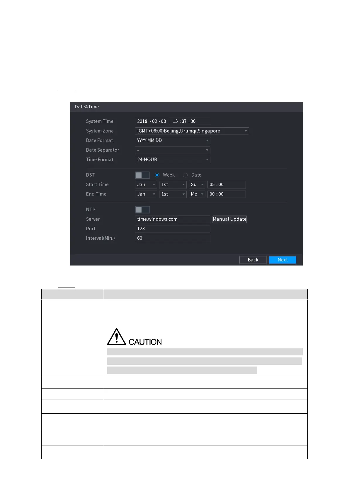 Configure the settings for date and time parameters. See Table 5-4. Step 2