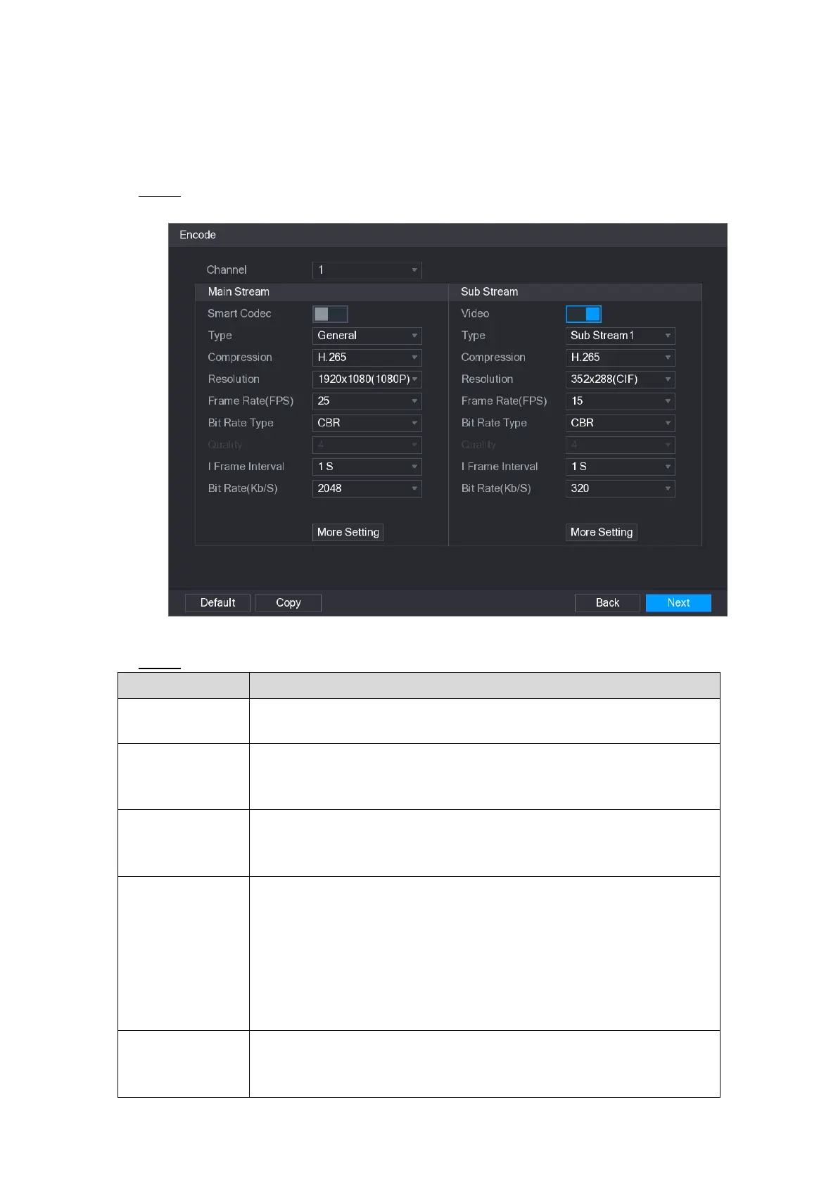 Configure the settings for the main/sub streams parameters. See Table 5-6. Step 2