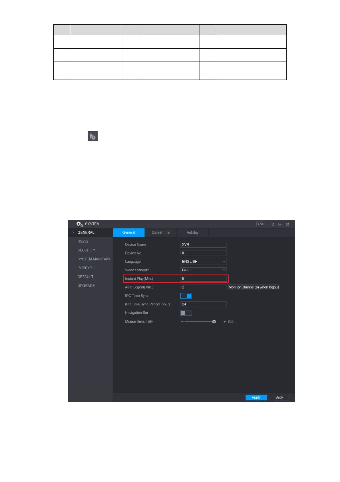 To change the playback time, select Main Menu > SYSTEM > GENERAL, in the Instant