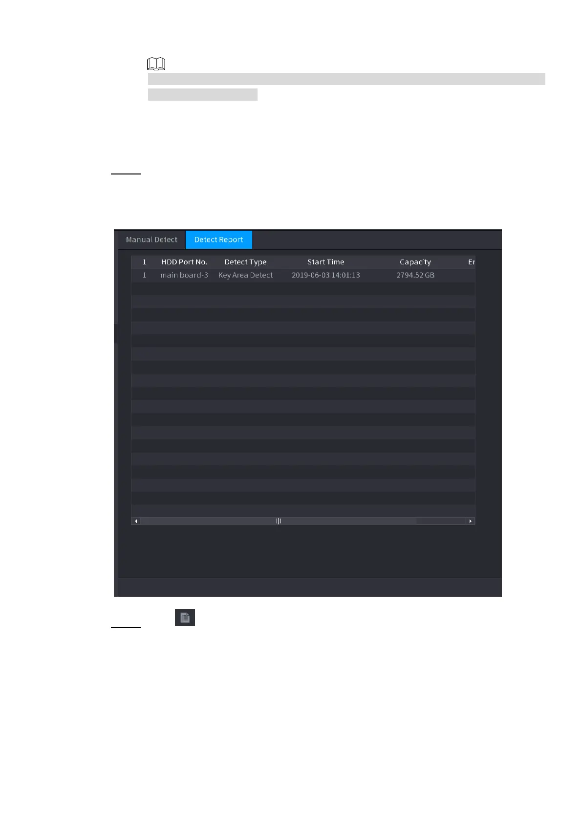 Step 1 Select Main Menu > STORAGE > HDD DETECT > Detect Report.