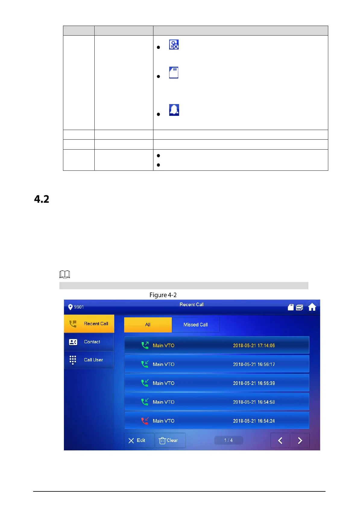For missed call, press the call button on the device front panel to enter the recent call interface.