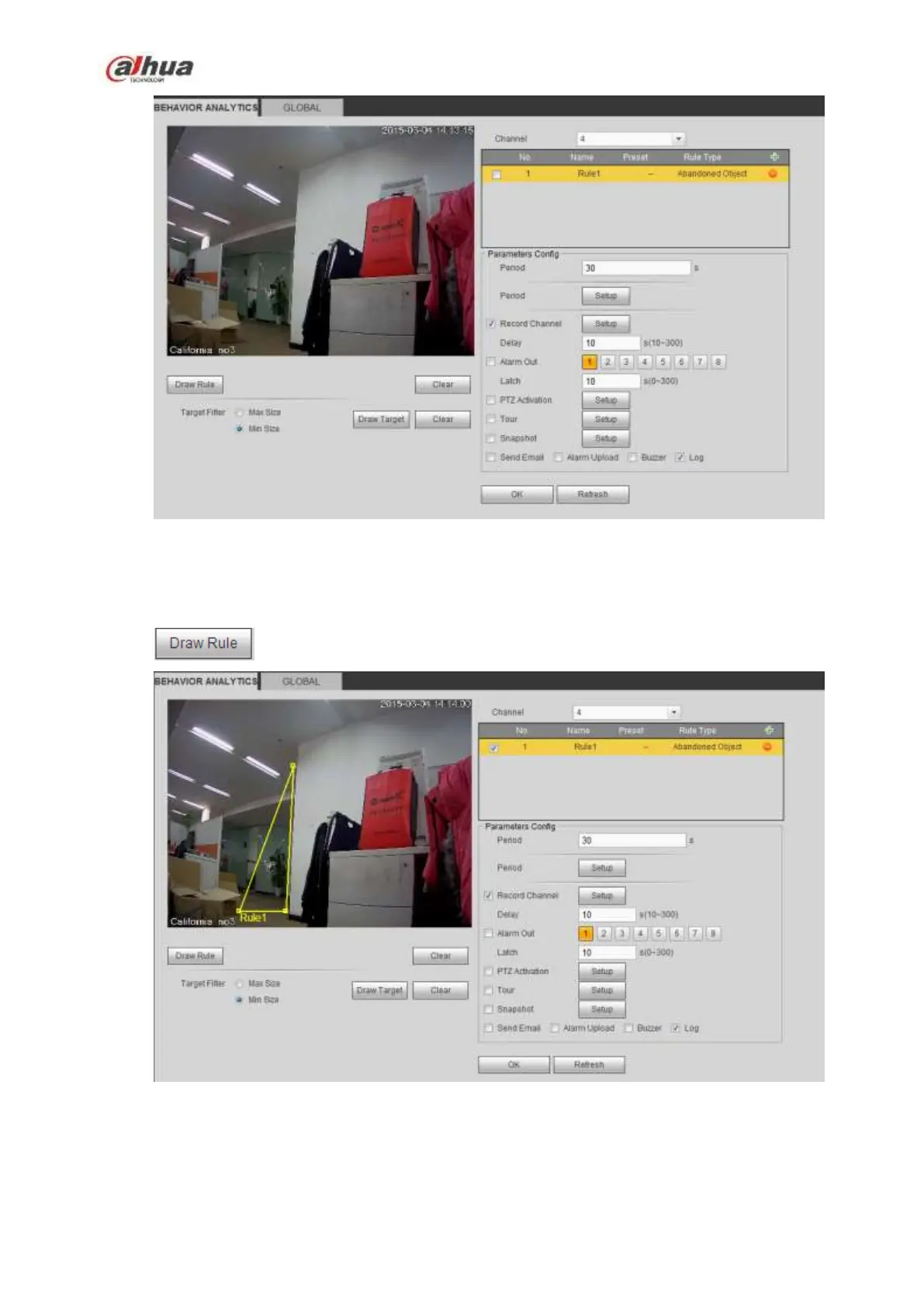 Period: System can generate an alarm once the object is in the zone for the specified period.