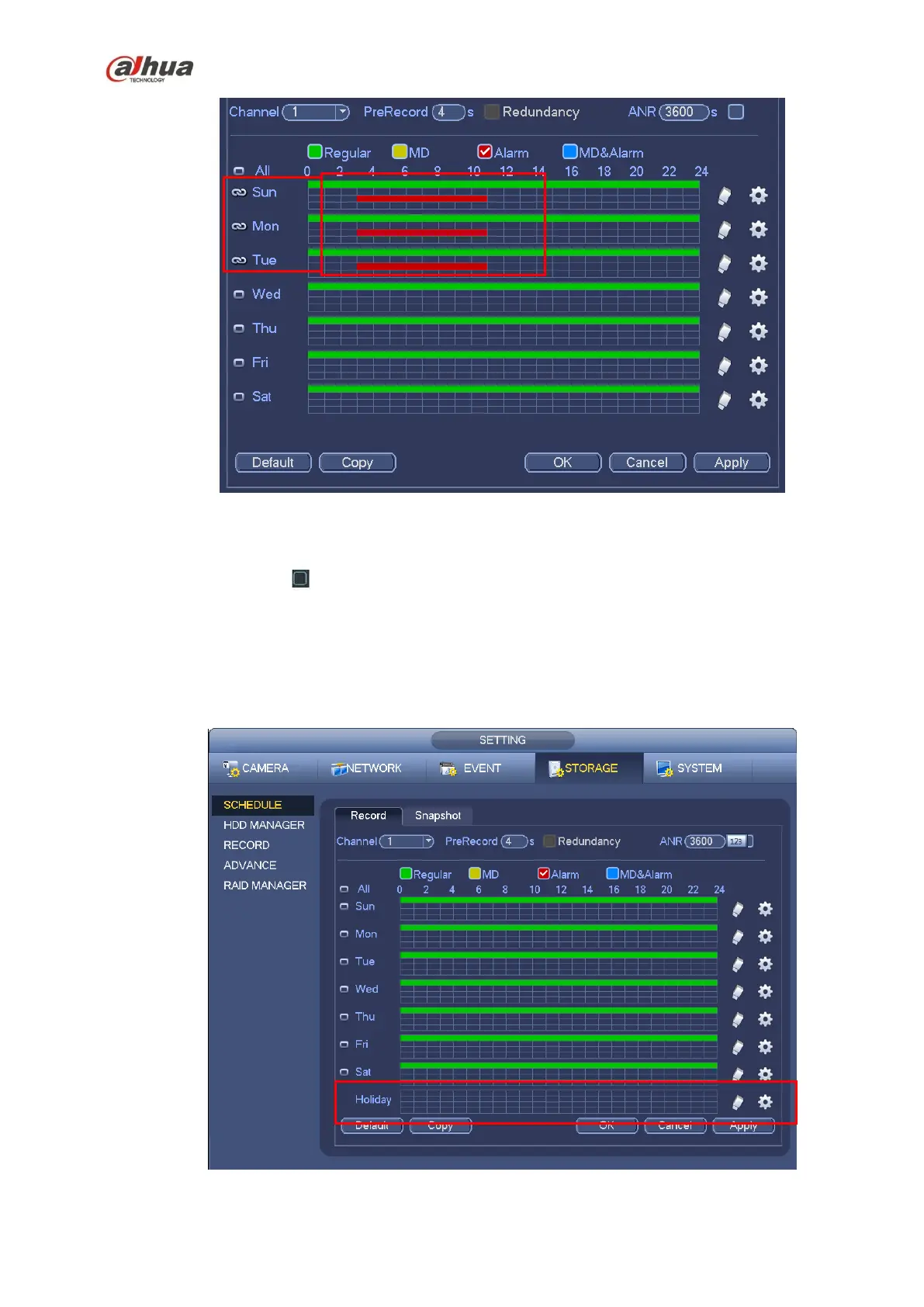 for motion detection and red color stands for alarm recording. The white means the MD and alarm