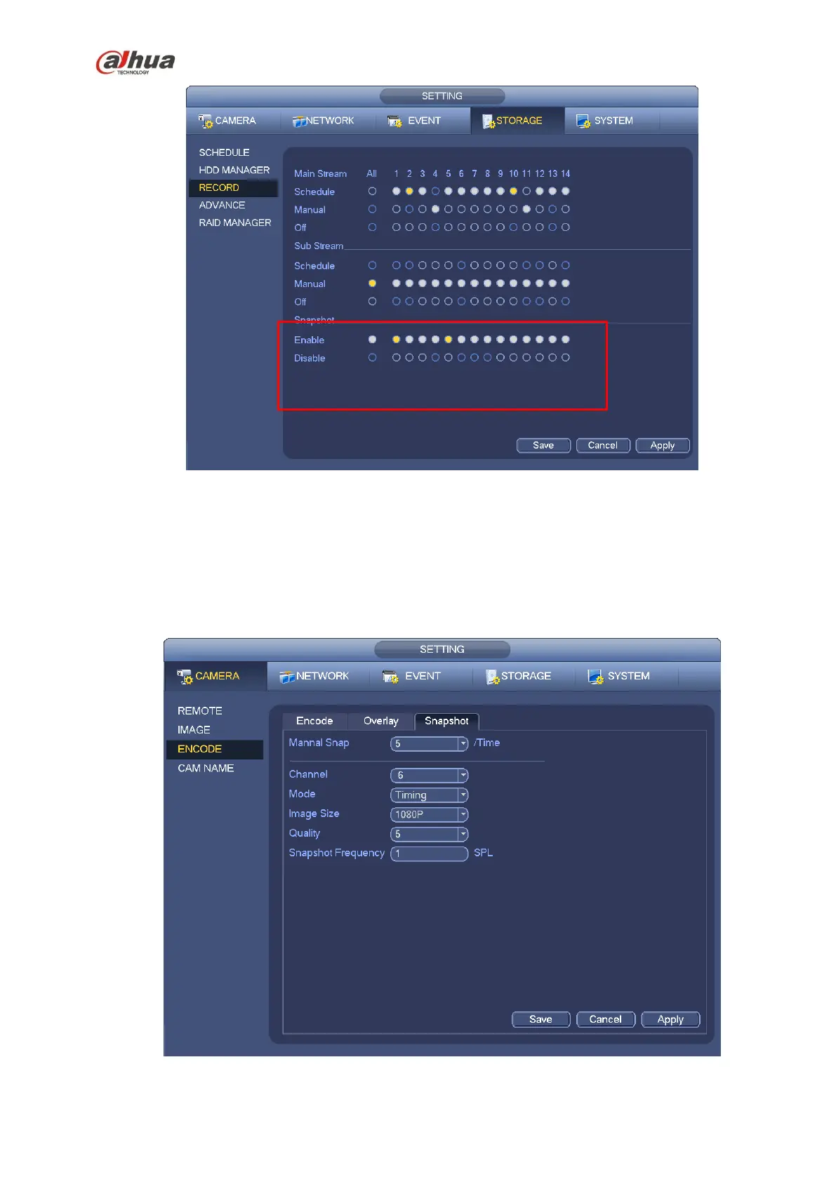 From Main menu->Setting->Camera->Encode->Snapshot, you can go to snapshot interface. See Figure