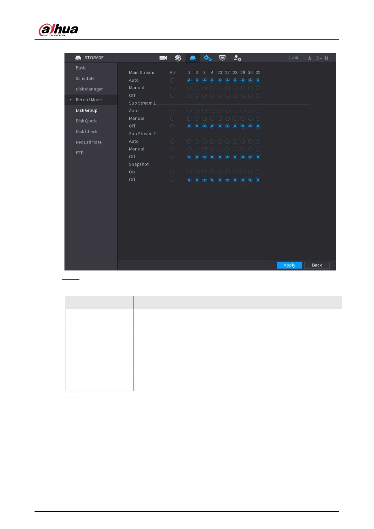 Auto: Automatically make recordings according to the schedule.