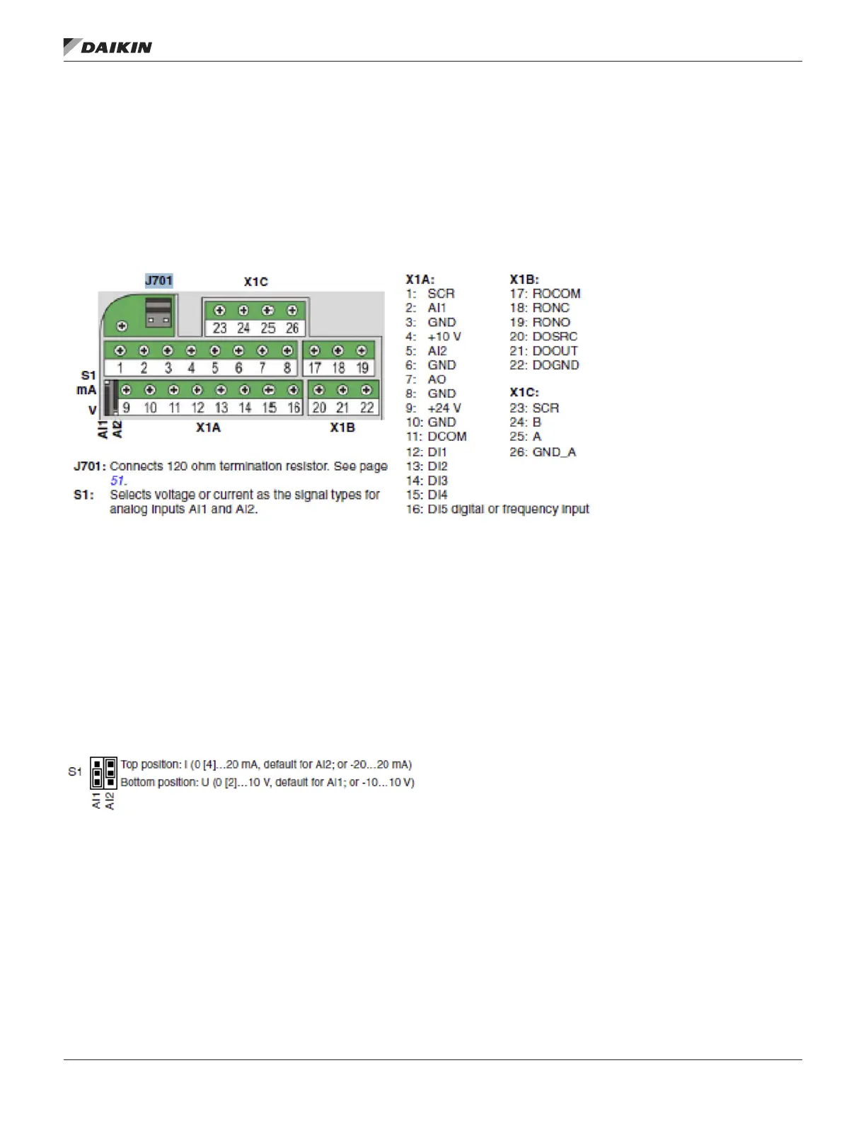 Switch S1 selects voltage (0 [2]…10 V / -10…10 V) or current