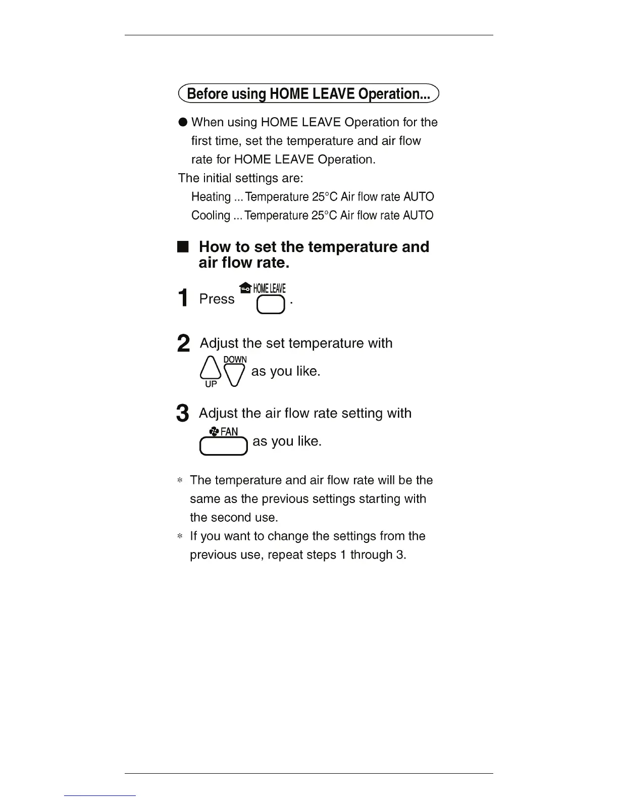 Daikin ARC417A14 - Home Leave Operation Setup; Setting Up Home Leave Operation; Setting Temperature and Air Flow Rate