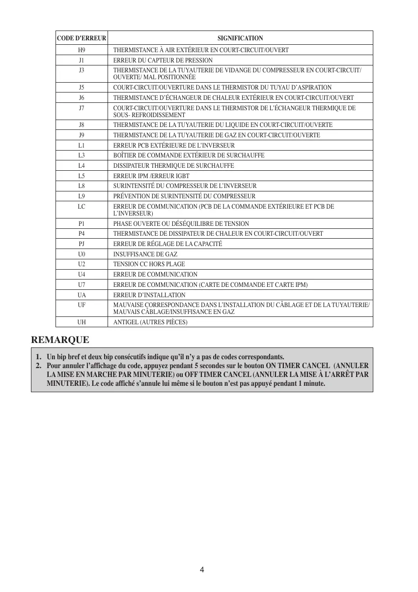 Pour annuler l’affichage du code, appuyez pendant 5 secondes sur le bouton ON TIMER CANCEL (ANNULER