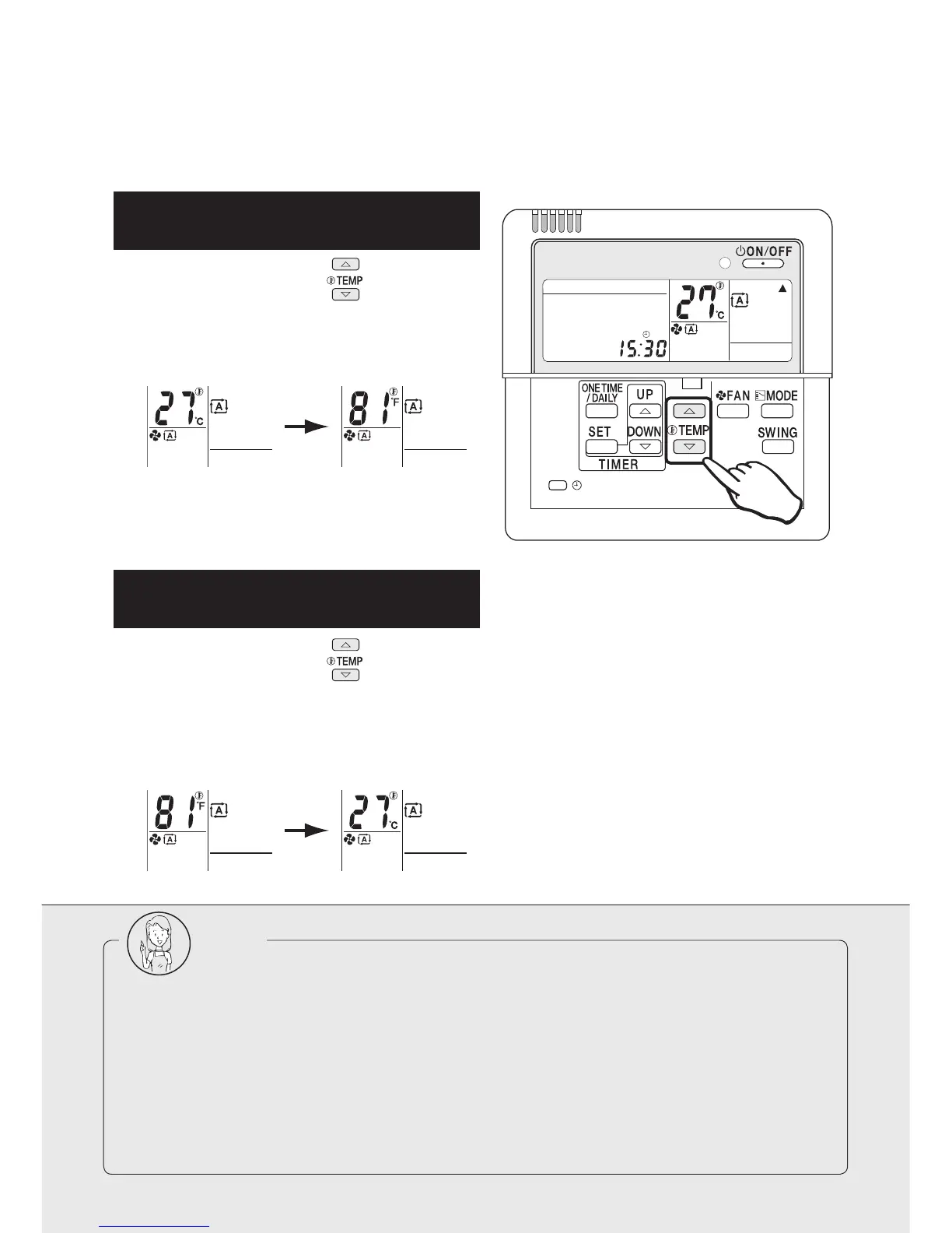 Temperature indication change between Celsius and Fahrenheit on the remote controller