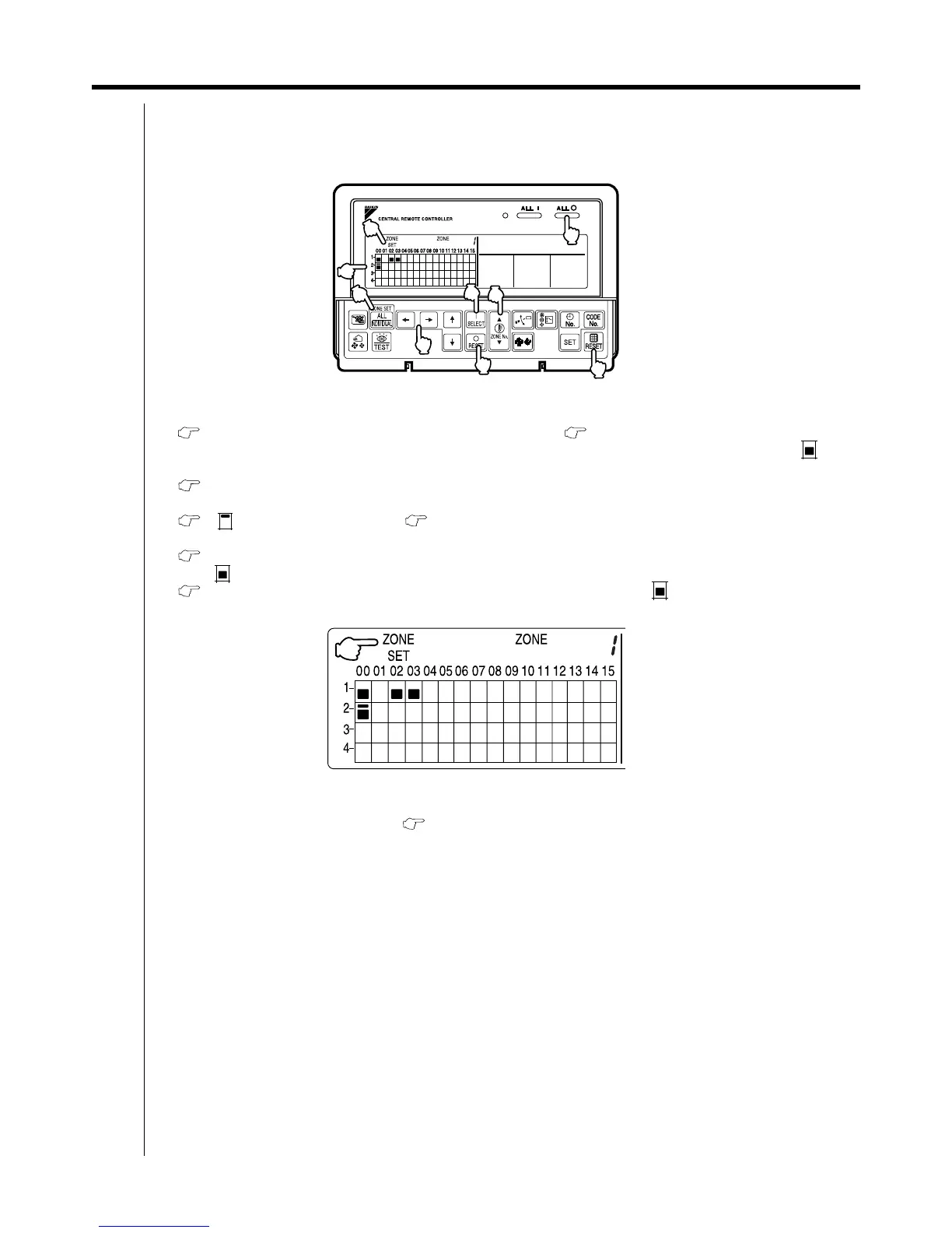 1. Pressing the "ALL/INDIVIDUAL" button for four seconds. Displays ZONE SET.