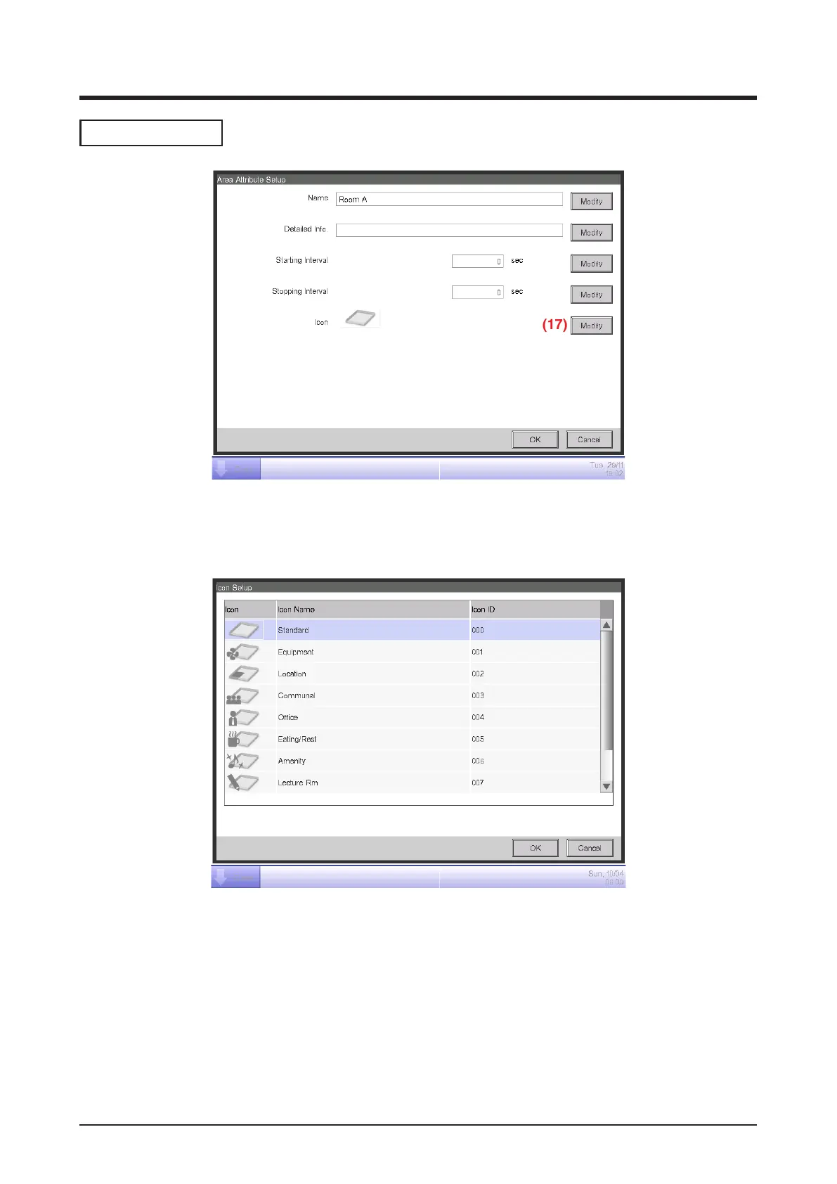 1. Touch the Modify button (17) on the Area Attribute Setup screen to display the Icon Setup