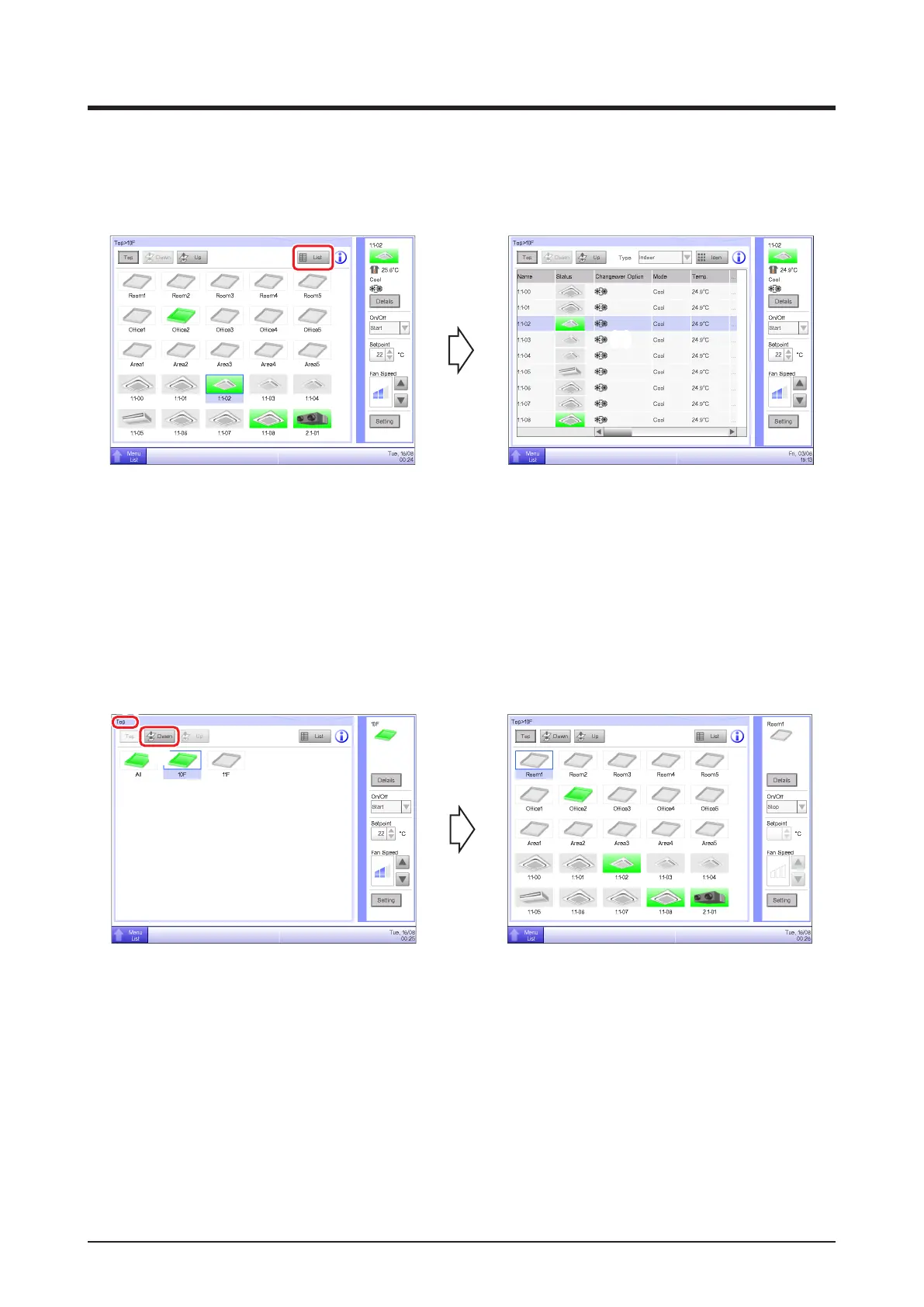 (2) The List View screen with the area and indoor unit names, the operation mode, setpoint, and