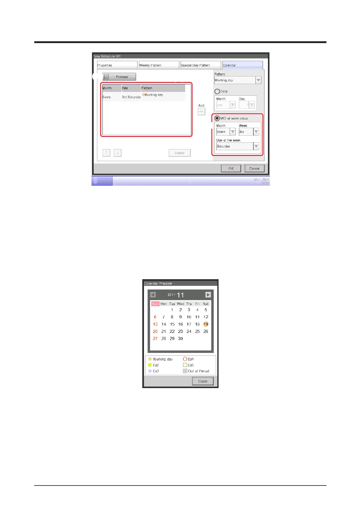 To preview the calendar with the special day pattern, touch the Preview button (23).
